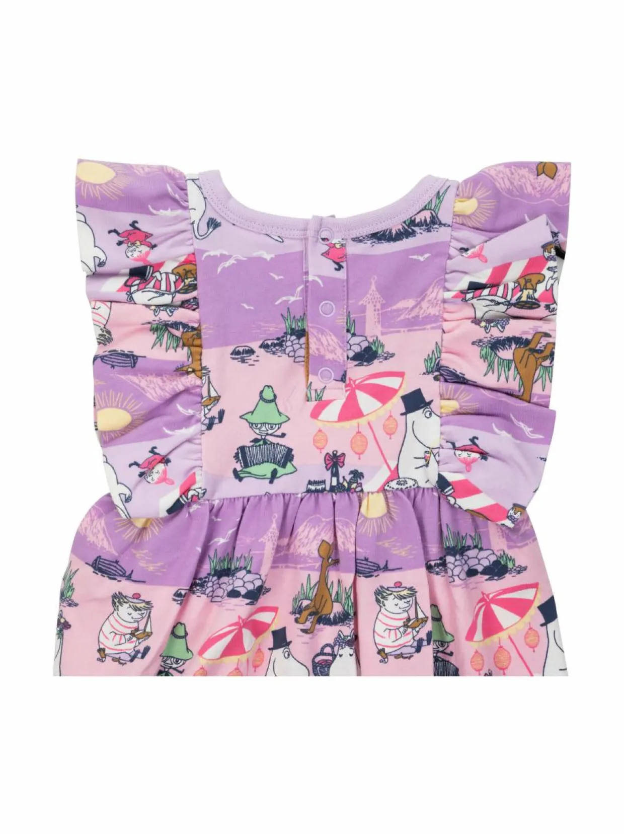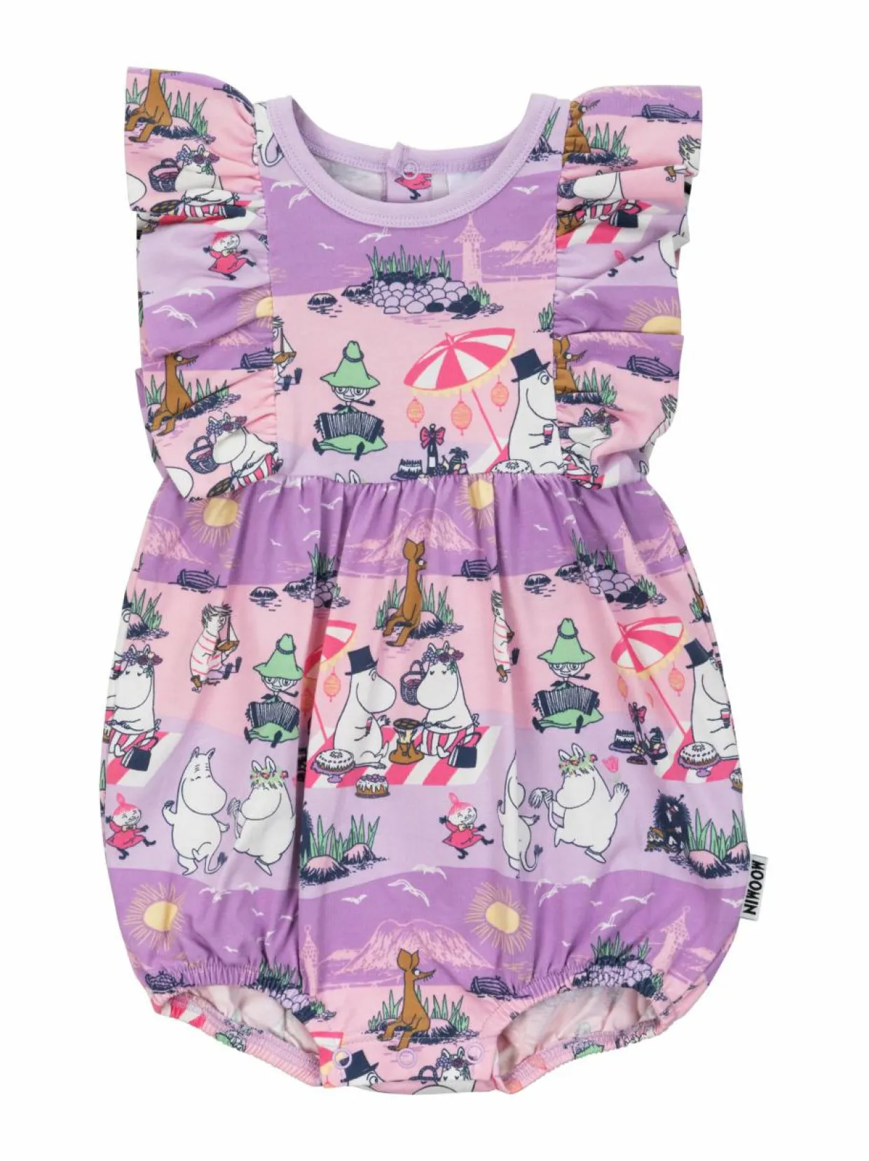 Ihastuttava frillasomisteinen leikkipuku vauvoille. Nepparit on sijoitettu haaraosaan sekä taakse. Jalantie on joustava. Muumi Rantapäivä -frillabody on valmistettu pehmeästä luomupuuvillasta, johon on lisätty elastaania tuomaan joustoa.