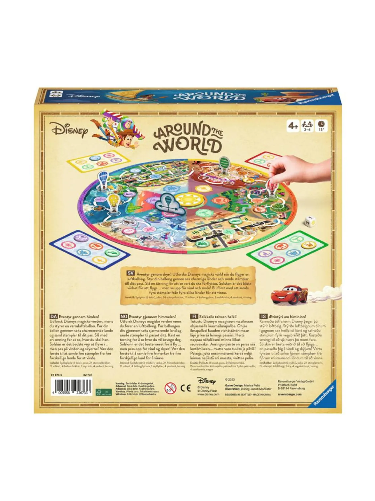 Disney Around The World -peli vie huimaavalle seikkailulle taivaan halki! Kuumailmapalloa ohjaamalla pelaajat pääsevät tutustumaan Disneyn taianomaiseen maailmaan. Pelilaudalta löytyy kuusi maata, joista pelaajat keräävät leimoja passiinsa. Noppa kertoo, minne liikkua seuraavaksi. Suotuisassa säässä on mukavaa lentää, mutta tuulta ja pilviä on syytä varoa! Voiton vie pelaaja, joka ensimmäisenä kerää neljä leimaa neljästä eri maasta. Ikäsuositus 4+