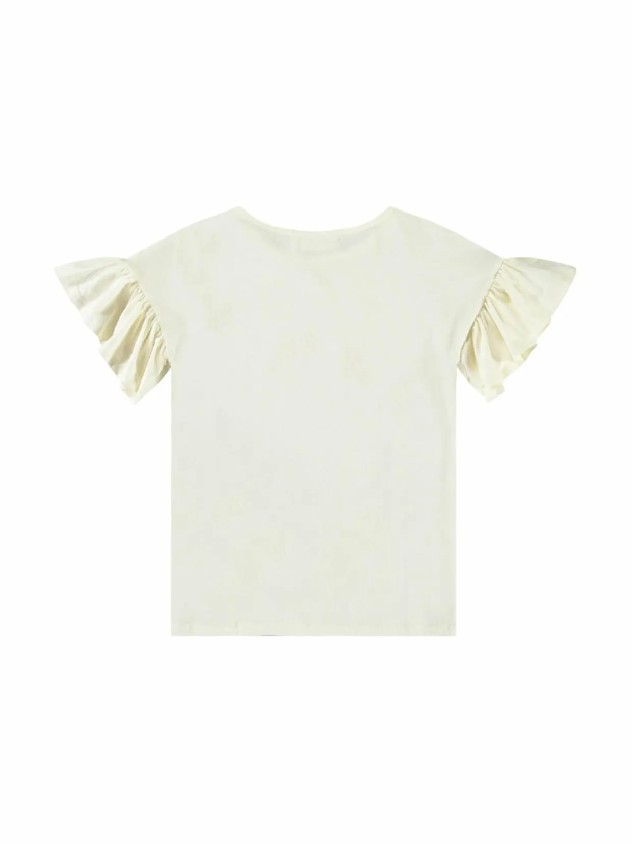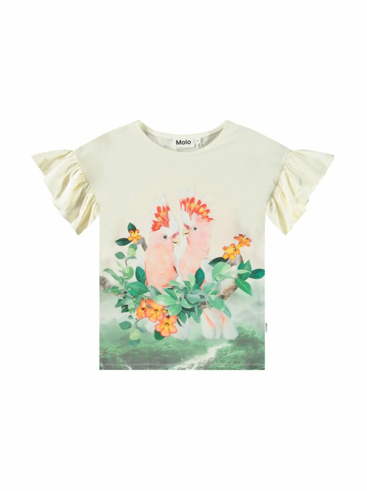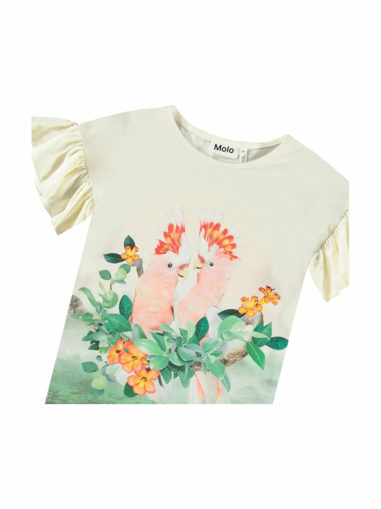 Molon Rayah t-paita on valmistettu pehmeästä ja mukavasta luomupuuvillasta ja elastaanista. T-paidassa on kaunis papukaija-, kukka- ja maisemakuvio. Mallissa on myös röyhelöiset hihat. Paita sopii täydellisesti tytöille, jotka rakastavat luontoa ja papukaijoja.