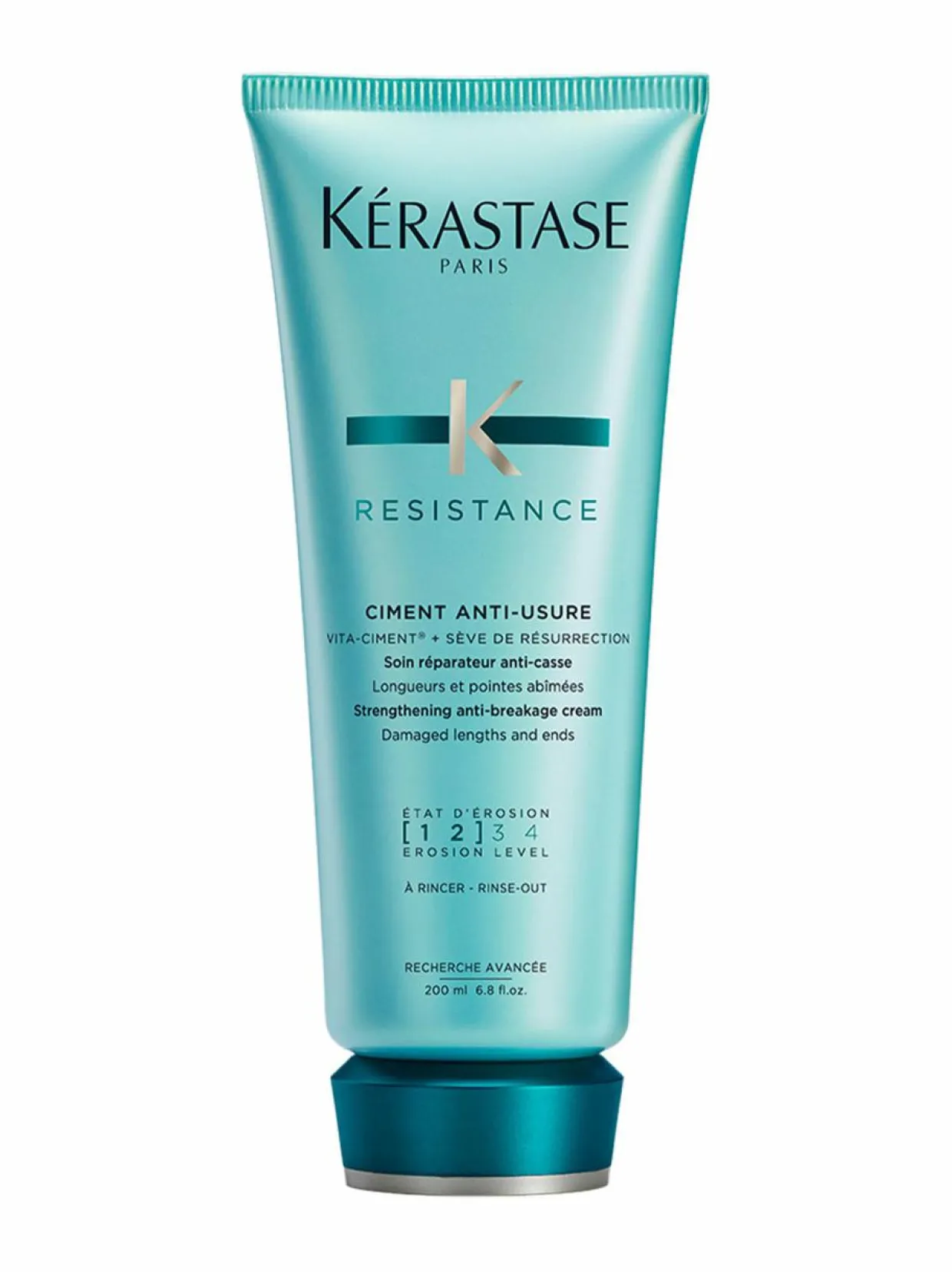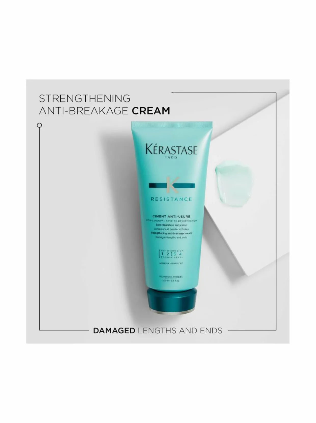 Kérastase Ciment Anti-Usure on hauraille ja hieman vahingoittuneille hiuksille kehitetty hoitoaine. Sen katkeilua vähentävä vaikutus auttaa jälleenrakentamaan hiuskuidun rakennetta tehden hiuksista vahvemmat ja kestävämmät.