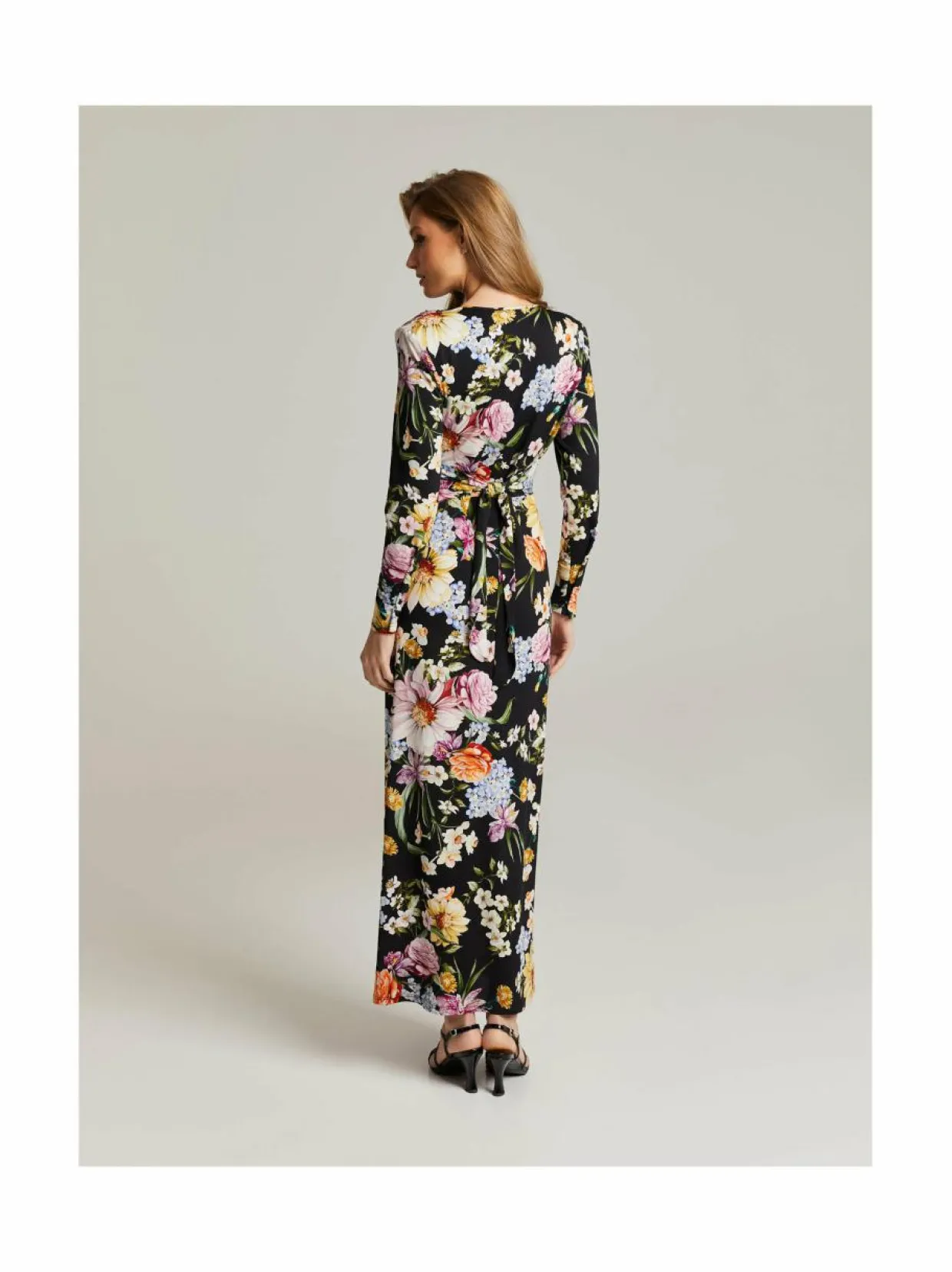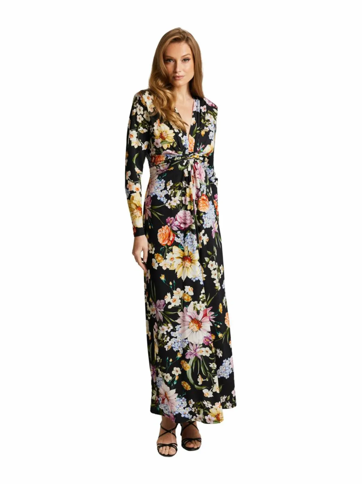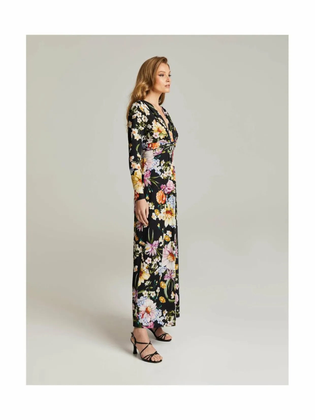 Kevytrakenteinen pitkä mekko Andiatalta. Siinä on viehättävä v-pääntie ja kangas on koristeltu hienolla kukkakuosilla. Tämä pitkähihainen ja hienosti laskeutuva mekko sopii moniin tilaisuuksiin. Materiaalina pehmeä viskoosi, joka sisältää myös elastaania joustavuutta varten.
