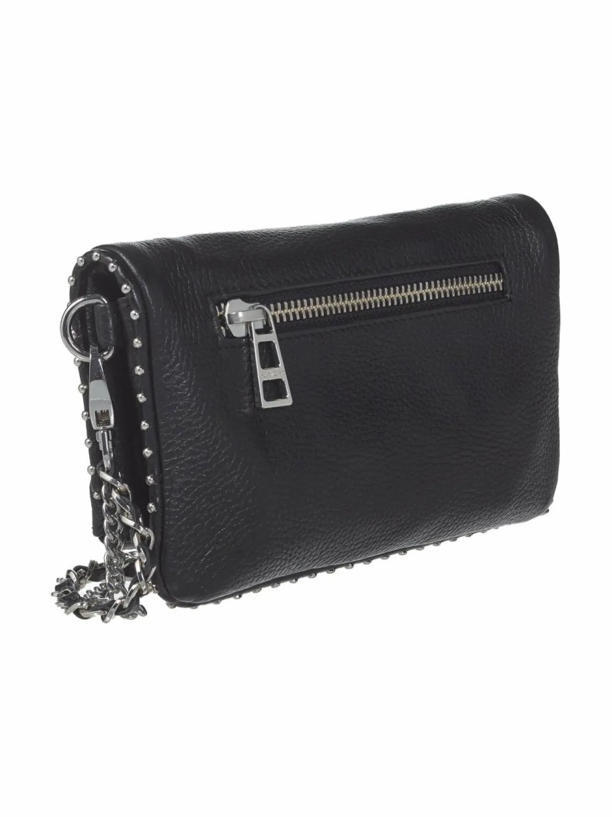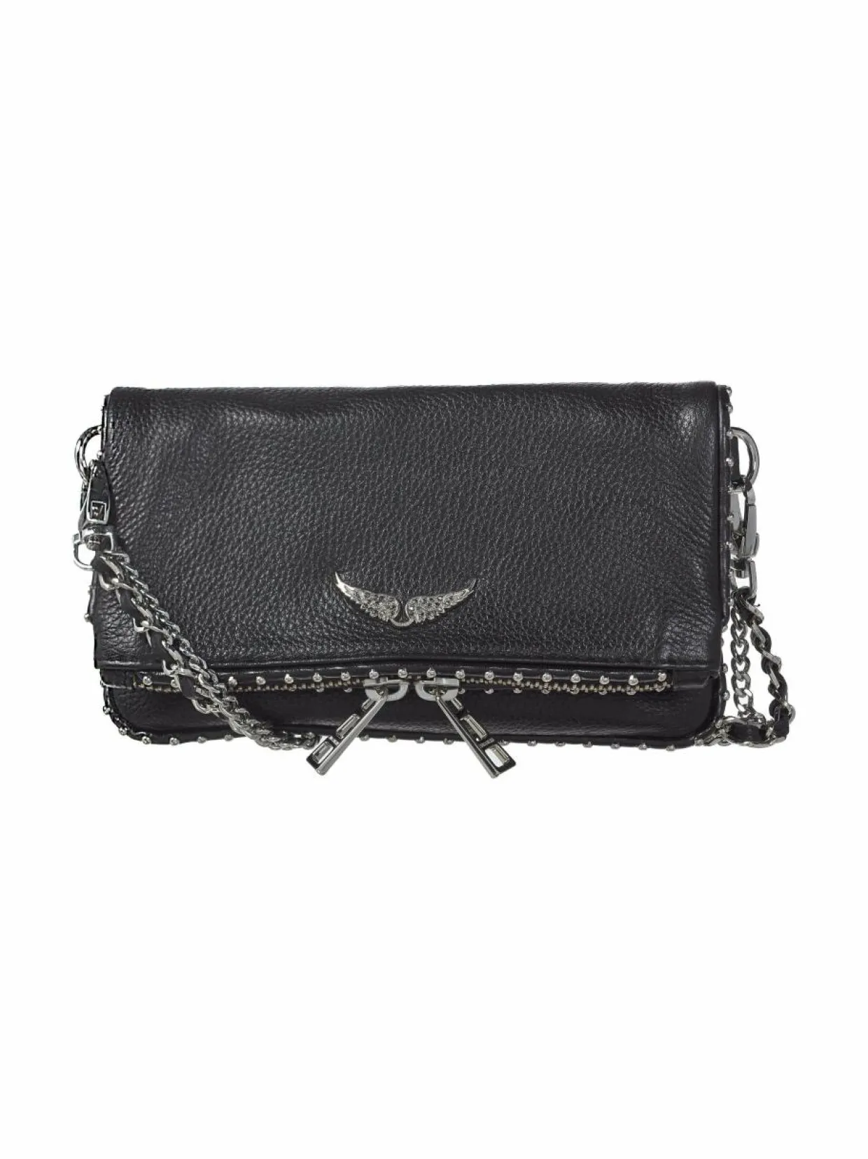 Rokkihenkistä Zadig&Voltaire-nahkalaukkua koristavat pienet metalliniitit ja metallinen siipilogomerkki. Pintakuvioidusta nahasta valmistetussa laukussa on kaksi hihnaa, jotka ovat irrotettavissa. Laukku taittuu kahtia ja kiinnittyy magneettinapeilla. Muodostuvan läpän alla on avonainen tasku. Laukku suljetaan vetoketjulla, ja sen sisäpuolella on tekstiilivuori. Laukun taustapuolella on lisäksi vetoketjullinen tasku.