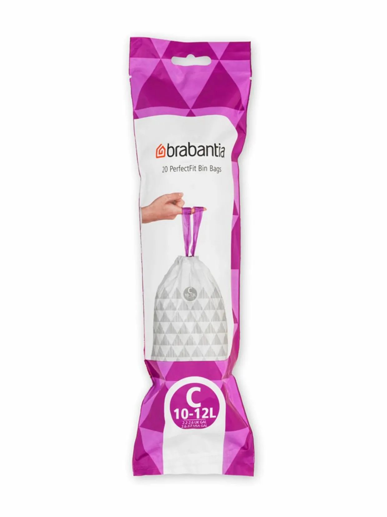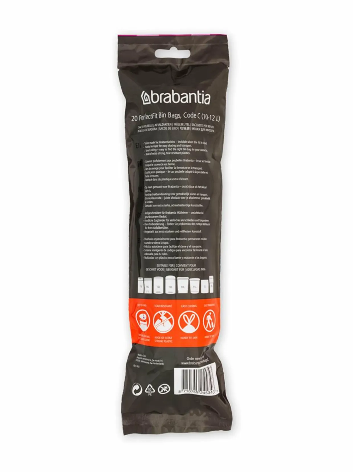 Erittäin kestävät roskapussit on suunniteltu sopimaan täydellisesti Brabantian roska-astioihin, joten ne eivät näy roska-astian reunoista. Pusseissa on myös kätevä sulkemisnauha. Yhden pussin koko on 12 litraa ja pakkauksessa on 20 pussia.