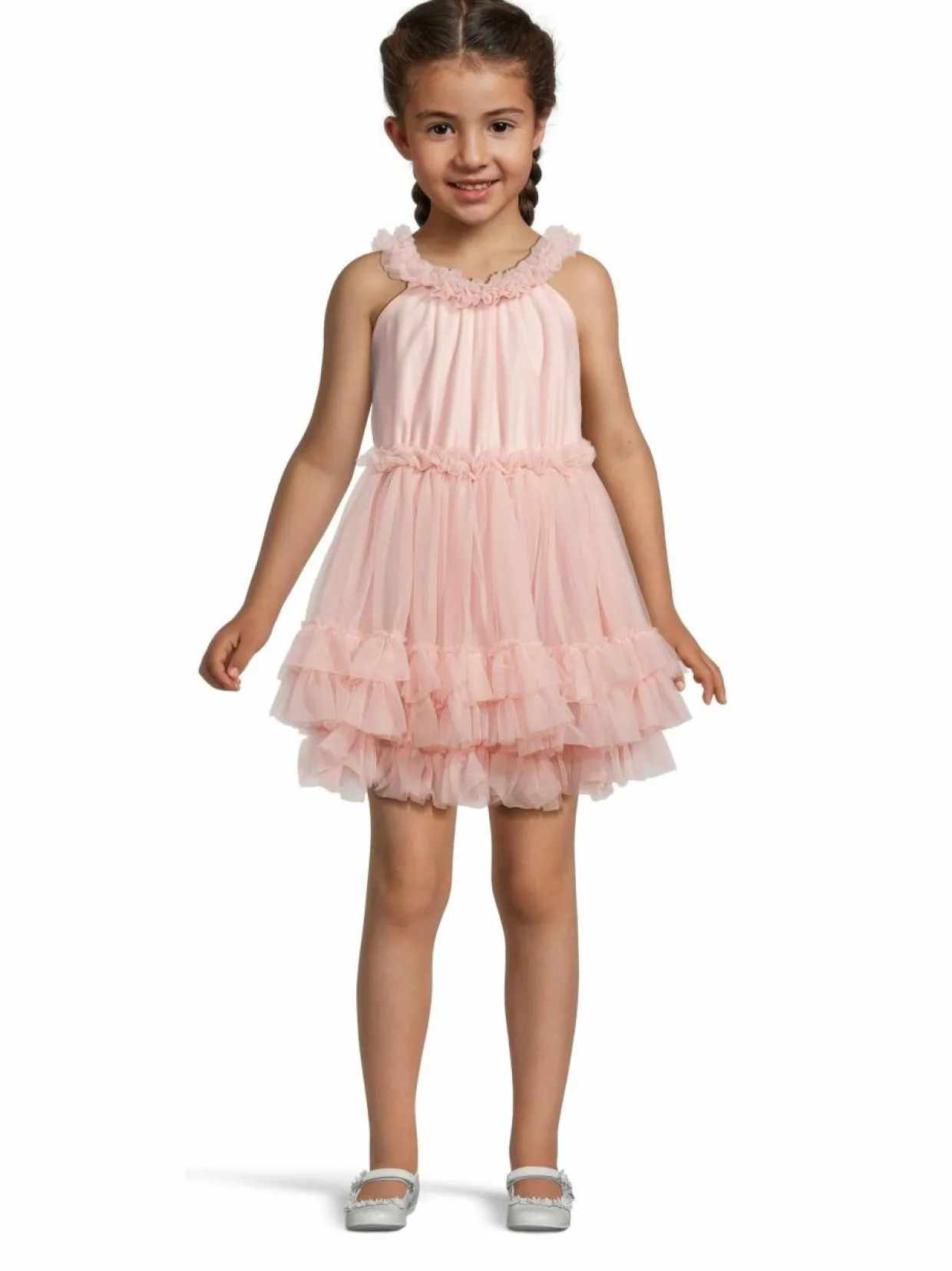Pehmeä volyymihelmainen mekko pikkuprinsessoille. Röyhelöolkaimet yhdistyvät kauniisti röyhelökoristeiseen yläosaan, jatkuen helmaan asti. Dolly by Le Petit Tom on brändi, jonka mekot ovat unenomaisia ja saavat inspiraationsa baletin tutuhameista.