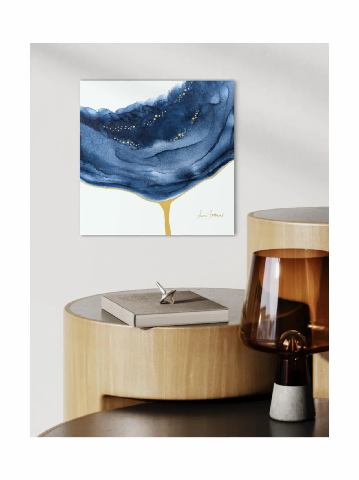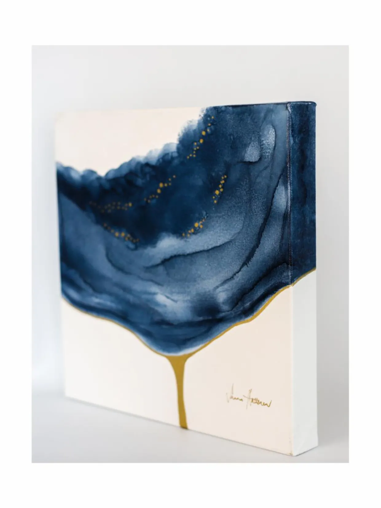 Abstrakti FREESIA-kukka on saanut inspiraationsa pohjoisen luonnosta. Taideteos on toteutettu sinistä alkoholimustetta puhaltamalla. Raikas ilme on viimeistelty kullansävyisillä yksityiskohdilla.