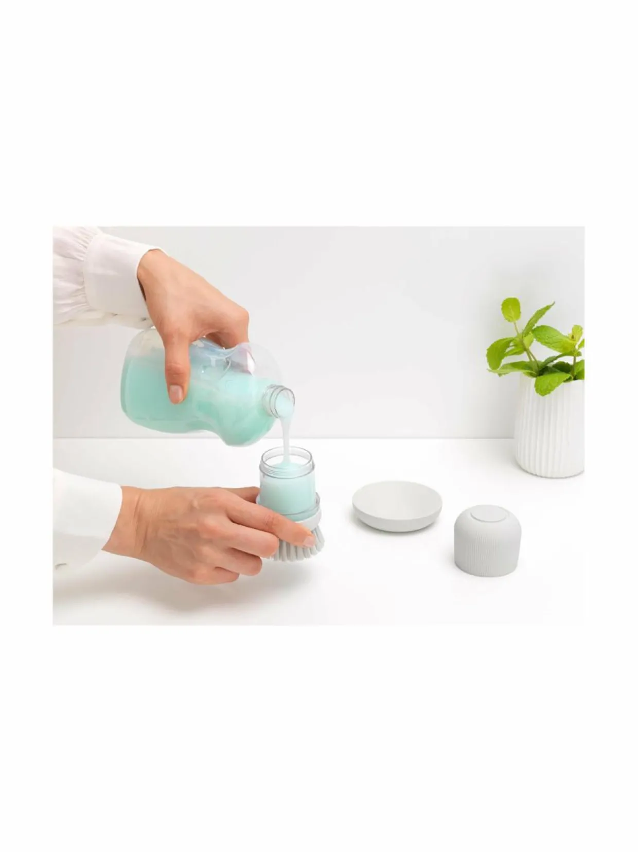 Brabantian saippuaa annosteleva tiskiharja on käytännöllinen ja helppo käyttää. Tiskiharja annostelee juuri sopivan määrän saippuaa tiskatessa, päällä on annostelunappi. Harjan pääty on ergonomisesti muotoiltu ja säiliö on helppo täyttää isosta täyttöaukosta. Tiskiharjan vaihtopäät myydään erikseen, mukana pakkauksessa yksi harja ja alusta. Mitat 8,6 x 8,6 x 10,5 cm.