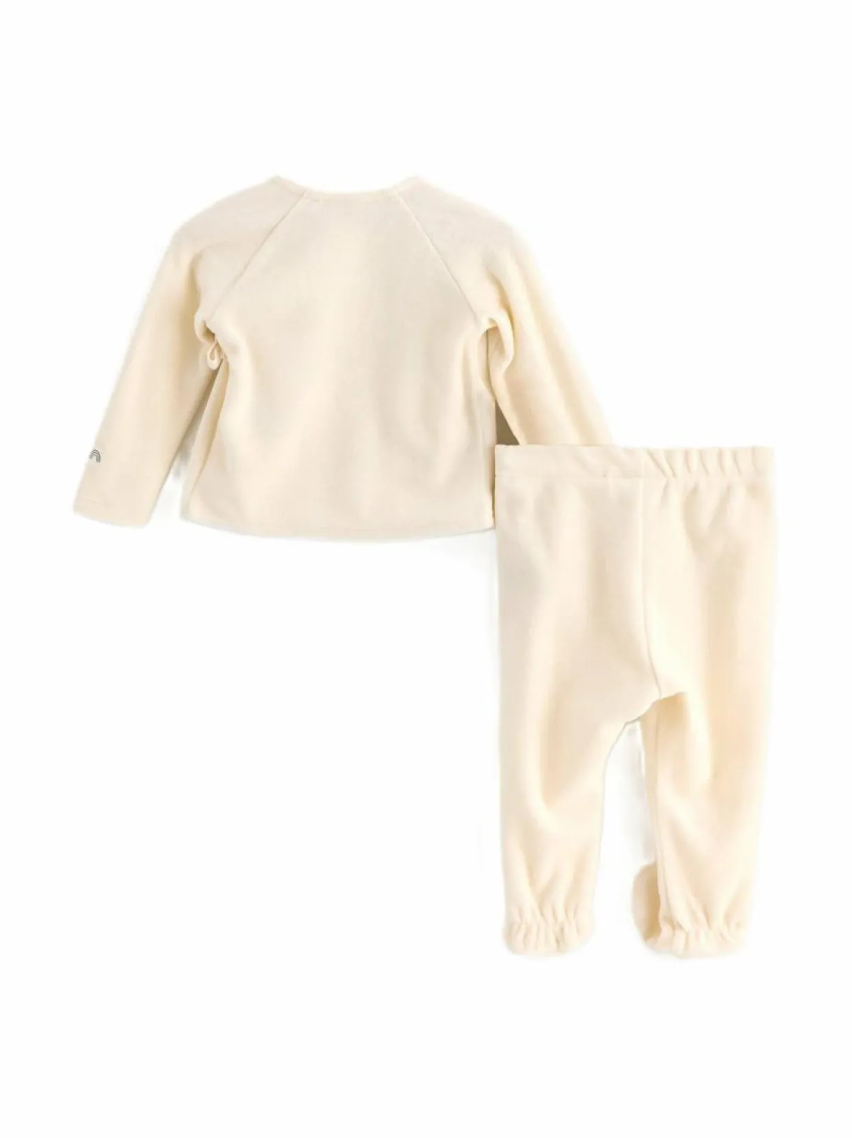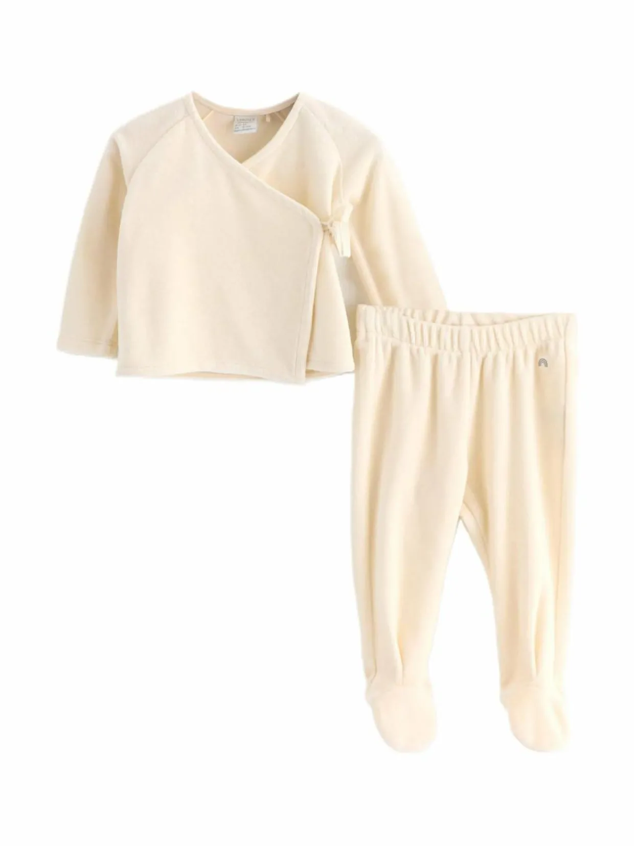 Lindexin pehmeä ja mukavan samettinen vaatesetti, joka on valmistettu puuvillasekoitteesta. Vaatesettiin kuuluu pitkähihainen kietaisupaita ja yhteensopivat housut, joissa on joustava vyötärö.