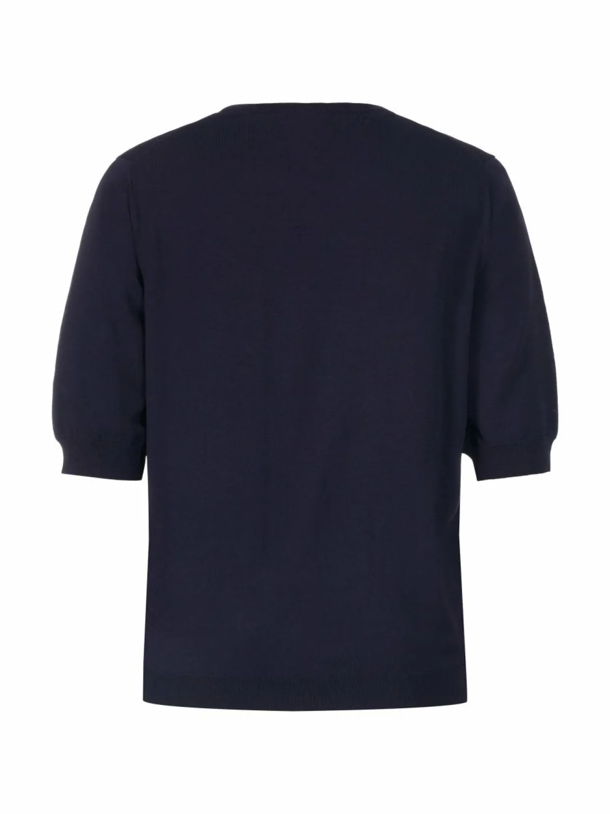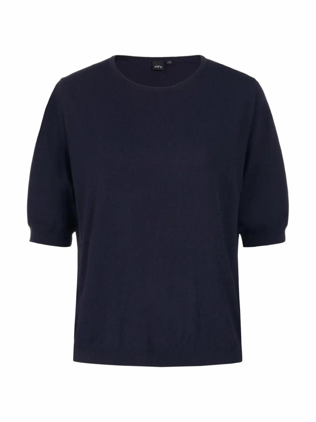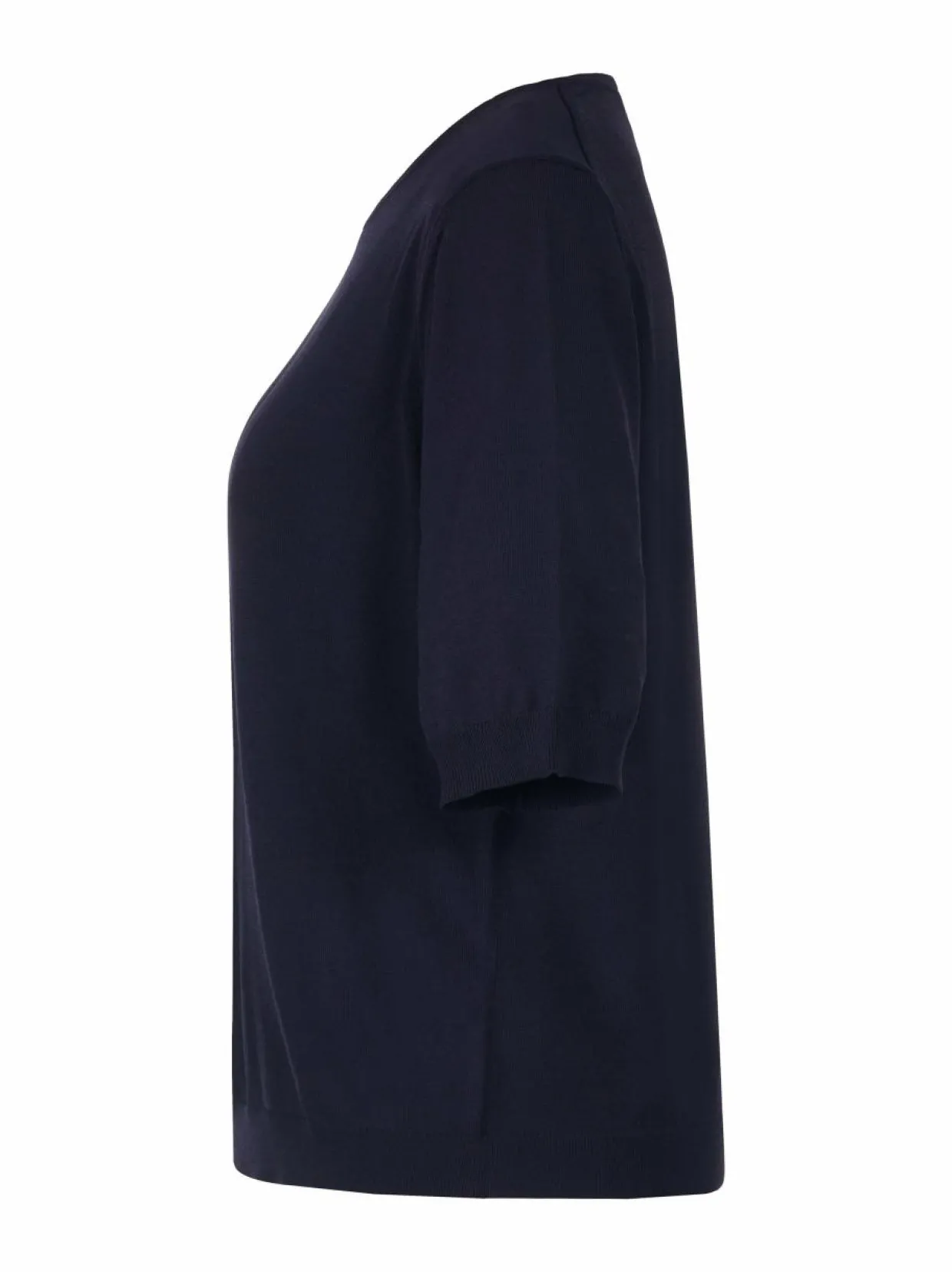 Sileä, himmeähohtoinen neule, jossa siro O-pääntie ja lyhyet hihat. Materiaalina on ohut neulos, joka on laadukasta ja ihastuttavan viileältä tuntuvaa viskoosi-polyamidisekoitetta. Takapituus on 56 cm koossa M.