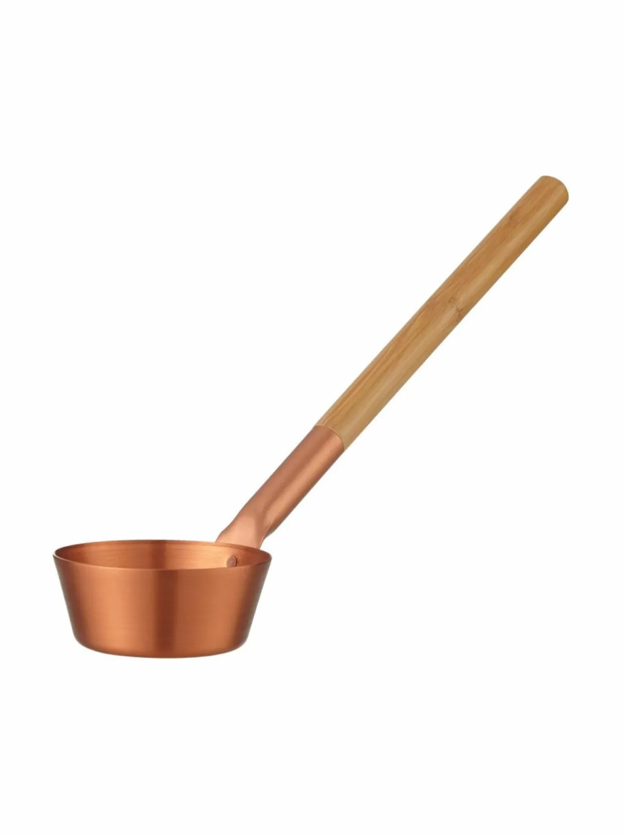 Pelkistetyn tyylikäs saunakauha on alumiinia ja bambua. Kauhaosan halkaisja on noin 12 cm.