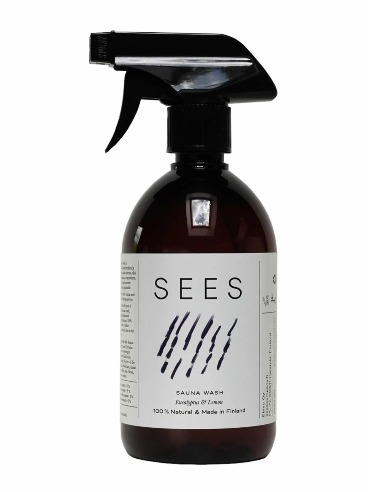 Biohajoava Sees Saunapesu on helppo tapa pestä koti- tai mökkisauna – ja samalla suihkuhuoneen kaakelit ja lasiovet. Spray-pullo tekee pesemisestä nopeampaa ja vaivatonta, eikä voimakasta jynssäämistä tarvita. Suomalaisena saunominen on lähellä sydäntä ja viihtyisän saunanillan saa aikaan puhdas ja raikkaan tuoksuinen sauna.Sooda-pohjainen saunapesu on tehokas pinttyneen lian ja hajujen poistaja. Eucalyptuksen ja sitruunan eteerisillä öljyillä tuoksutettu saunapesu on valmistettu korkealaatuisista kasviperäisistä raaka-aineista. Tuoksussa yhdistyy raikkaan sitruunan ja virkistävän eucalyptuksen eteeriset öljyt, jotka yhdessä piristävät ja raikastavat tehokkaasti koko saunan sekä tunkkaisen huoneilman. Pesun yhteydessä eteeristen öljyjen arvokkaat tuoksut vaeltavat ympäriinsä ja voit nauttia niiden aikaansaamasta aromaterapiasta.Saunapesu ei ainoastaan piristä pelkkää saunaa, vaan myös pesijän mielen. Suomessa valmistettu saunanpesuaine kuormittaa vähemmän luontoa ja on 100 % luontoon biohajoava. Pesuaineessa ei ole käytetty keinotekoisia ainesosia tai tuoksuaineita.Saunapesuaineella peset kätevästi lauteet, penkit, seinät, lattiat, suihkutilat ja jopa saunan vadit — erinomainen valinta suomalaiseen saunaan.