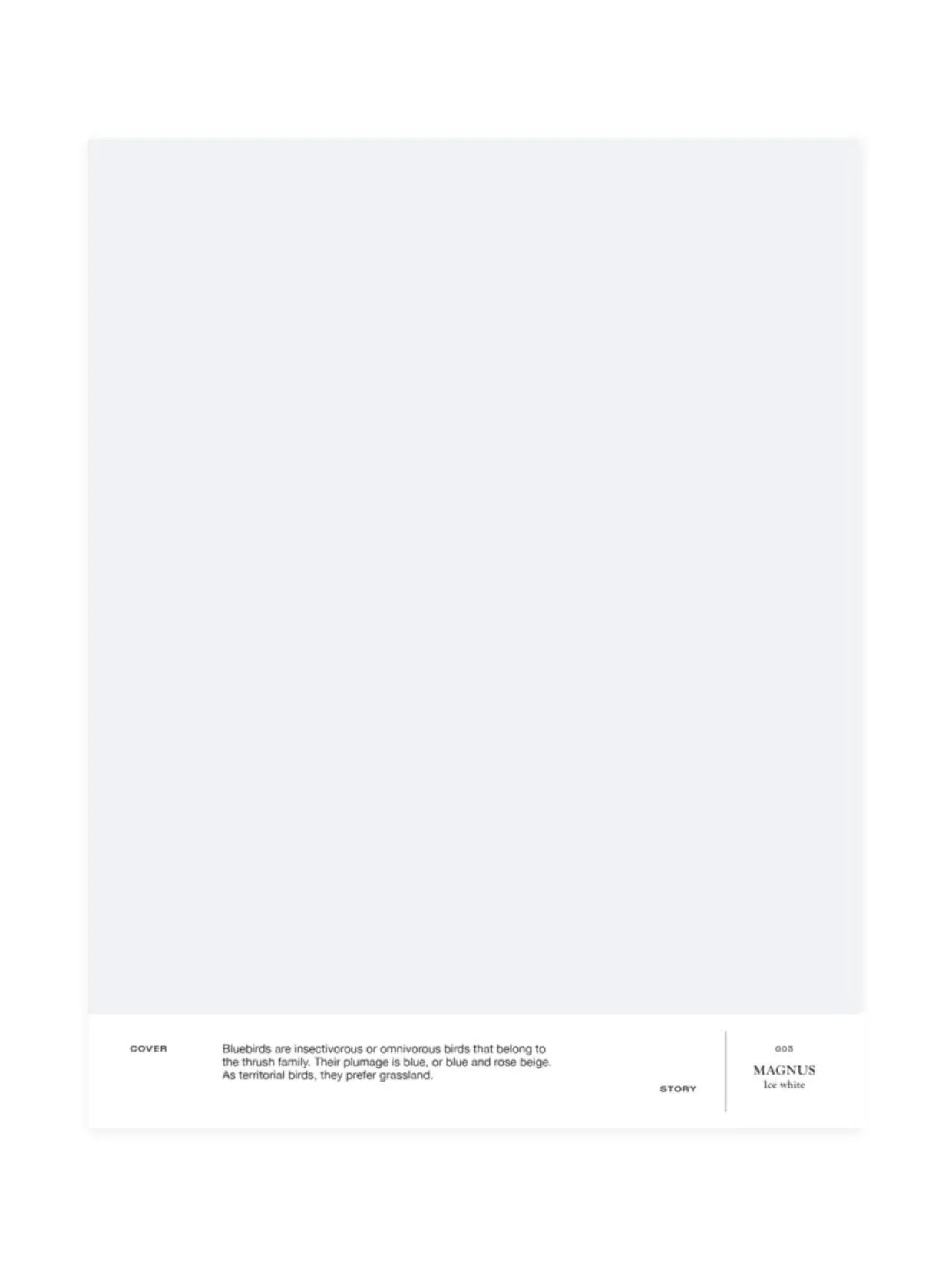 003 MAGNUS on kevyesti vaaleansiniseen taittava kuulas valkoinen. A4-kokoinen ja tarrataustainen värimalli on maalattu aidolla täyshimmeällä Cover Story -maalilla, joten voit olla varma, että sävy on sama kuin varsinaisessa maalissa. Mallitarran voi liimata helposti suoraan maalattavalle pinnalle ja katsoa, miltä sävy näyttää erilaisissa valaistuksissa, sillä valon laatu ja määrä vaikuttavat merkittävästi siihen, miten havaitsemme värin.