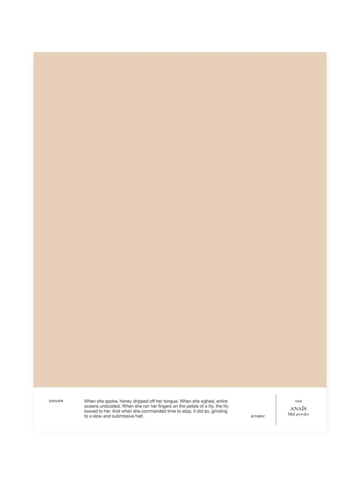 024 ANAÏS on täydellinen puuterin sävy, joka sopii lähes jokaisen sävyn kumppaniksi ja luo tilaan pehmeää harmoniaa. A4-kokoinen ja tarrataustainen värimalli on maalattu aidolla täyshimmeällä Cover Story -maalilla, joten voit olla varma, että sävy on sama kuin varsinaisessa maalissa. Mallitarran voi liimata helposti suoraan maalattavalle pinnalle ja katsoa, miltä sävy näyttää erilaisissa valaistuksissa, sillä valon laatu ja määrä vaikuttavat merkittävästi siihen, miten havaitsemme värin.
