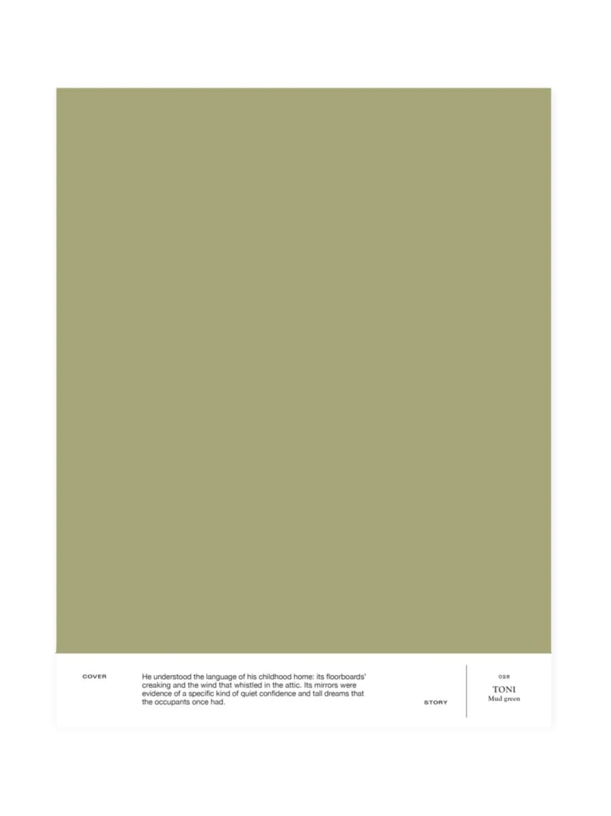 028 TONI on tummaan taitettu oliivinvihreä. Tasapainoinen ja eteerinen oliivinvihreä nautiskelee vaaleansinisestä seurasta. A4-kokoinen ja tarrataustainen värimalli on maalattu aidolla täyshimmeällä Cover Story -maalilla, joten voit olla varma, että sävy on sama kuin varsinaisessa maalissa. Mallitarran voi liimata helposti suoraan maalattavalle pinnalle ja katsoa, miltä sävy näyttää erilaisissa valaistuksissa, sillä valon laatu ja määrä vaikuttavat merkittävästi siihen, miten havaitsemme värin.