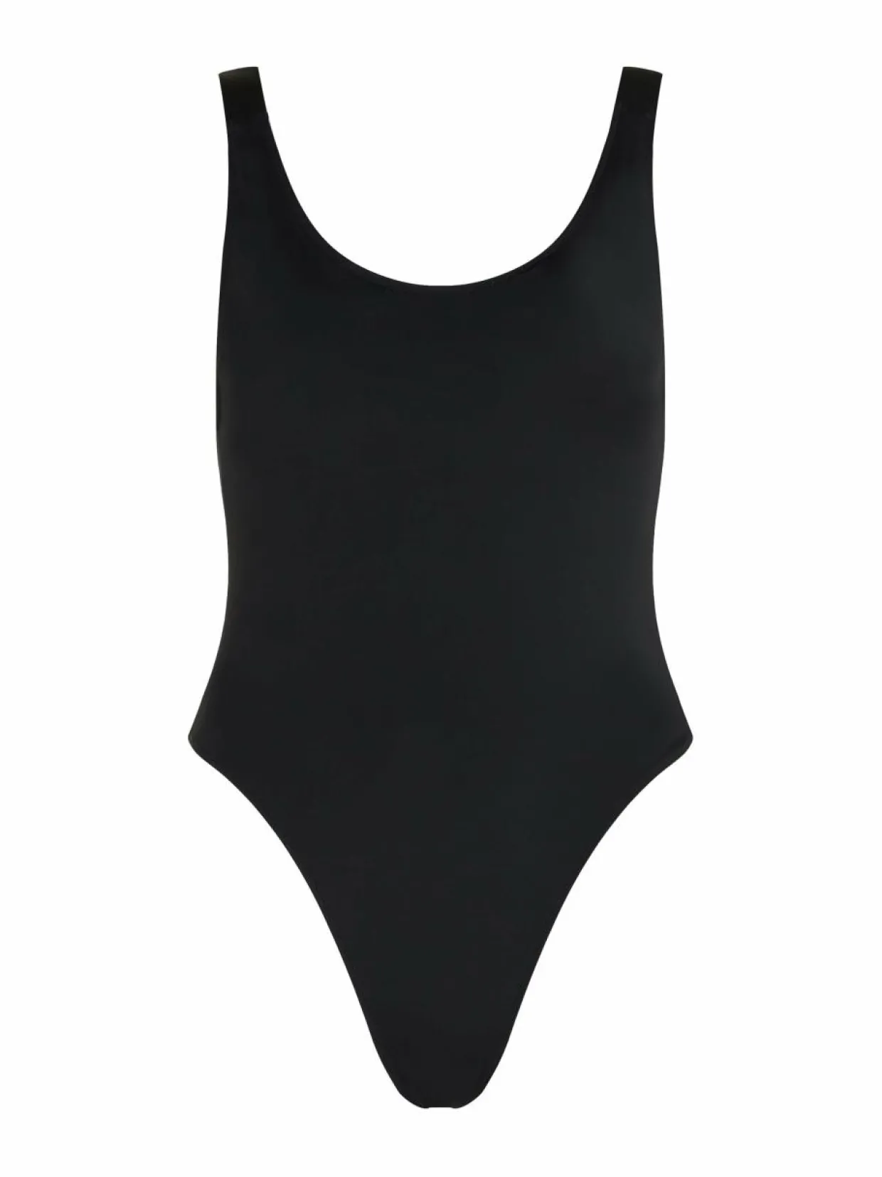 Moderni uimapuku kontrastisella logotekstillä edessä. Myös olkaimissa on selkäpuolella logotekstit. Mallissa on selän paljastava leikkaus. 78 % kierrätyspolyamidia.