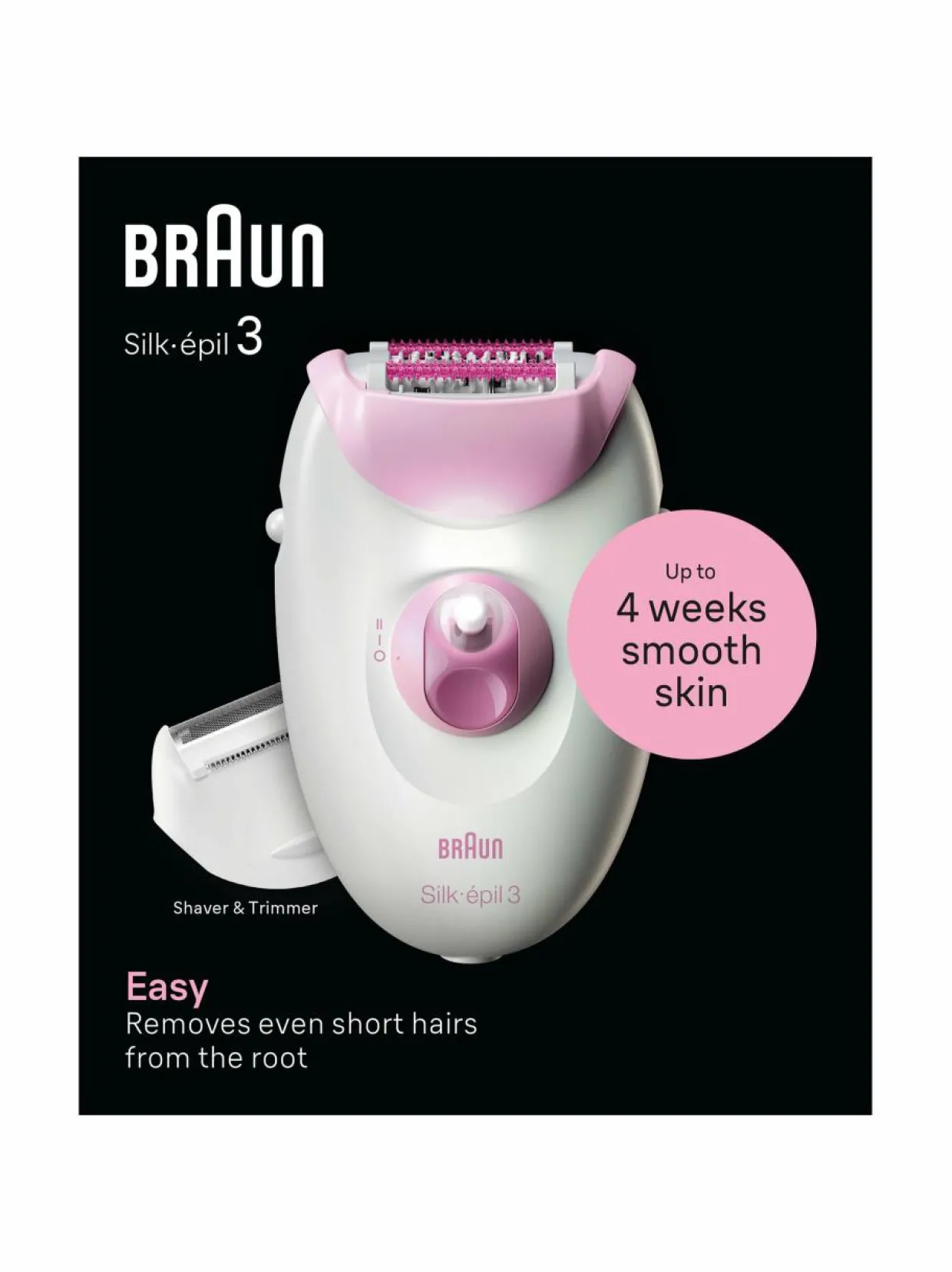 Epilointi tarjoaa mukavamman vaihtoehdon kuin sotkuiset ja vaivalloiset vahausmenetelmät. Tämä Braun-merkin epilaattori tarjoaa kätevän tavan ylläpitää sileää ihoa jopa kuukaudeksi. Siirry vahaamisesta Braun Silk-épil 3 -epilaattorin käyttöön, mikä tekee karvanpoistosta vaivatonta ja tehokasta. Tämä laite on johdollinen, tarjoten jatkuvan tehon ilman huolta akun loppumisesta tai keskeytyksistä. Saksassa valmistettu laite on suunniteltu kestämään, tarjoten pitkäaikaista sileyttä luotettavalla teknologialla.