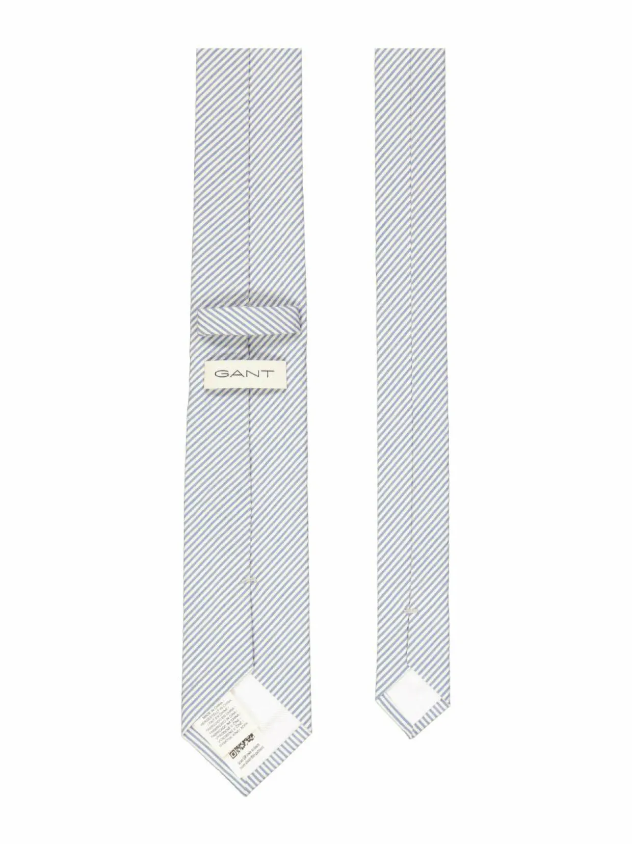 Gantin 100 % silkistä valmistetussa solmiossa on seersucker-raitakuosi. Säädettävässä solmiossa on regular fit -mitoitus ja terävä kärki.