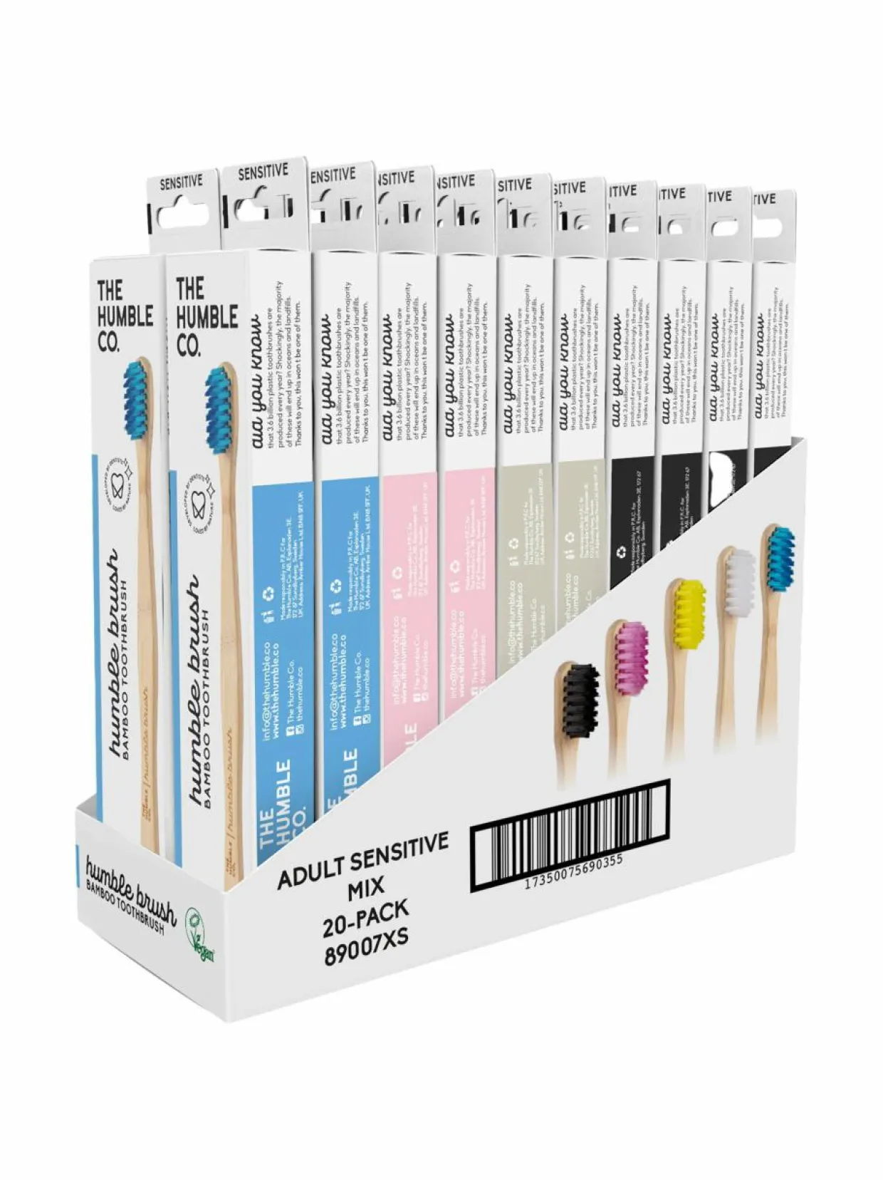 Humble Brush on kestävä valinta! Humble Brush Sensitive -hammasharjan erittäin pehmeät harjakset hoitavat hampaita ja ikeniä entistä hellävaraisemmin. Humble Brush -hammasharjan varsi on 100 % biohajoavaa bambua. Bambu on maapallon nopeimmin kasvava materiaali. Se on luonnostaan antibakteerista, eikä sen viljelyssä käytetä lannoitteita tai torjunta-aineita. Harja on pakattu läpinäkyvään ja biohajoavaan, täysin kasvipohjaiseen kääreeseen. Harjan pahvipakkaus on tehty 100 % kierrätysmateriaalista. Humble Brushin varren voi katkaista kompostiin, mutta harjaksia valitettavasti ei. Ne hajoavat biologisesti 2-3 vuodessa jättämättä minkäänlaisia toksiineja jälkeensä. Viiden värin lajitelma. Aikuisten koko.