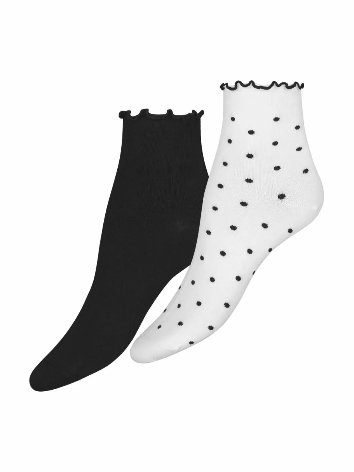 Kiristämättömät röyhelöreunuksiset nilkkasukat Vogue merkiltä. Pakkauksesta löydät kaksi sukkaparia, joista toinen on yksivärinen ja toisessa on elegantti pilkkukuosi. Serena-sukkien materiaalina on käytetty pehmeän tuntuista luomupuuvillasekoitetta.