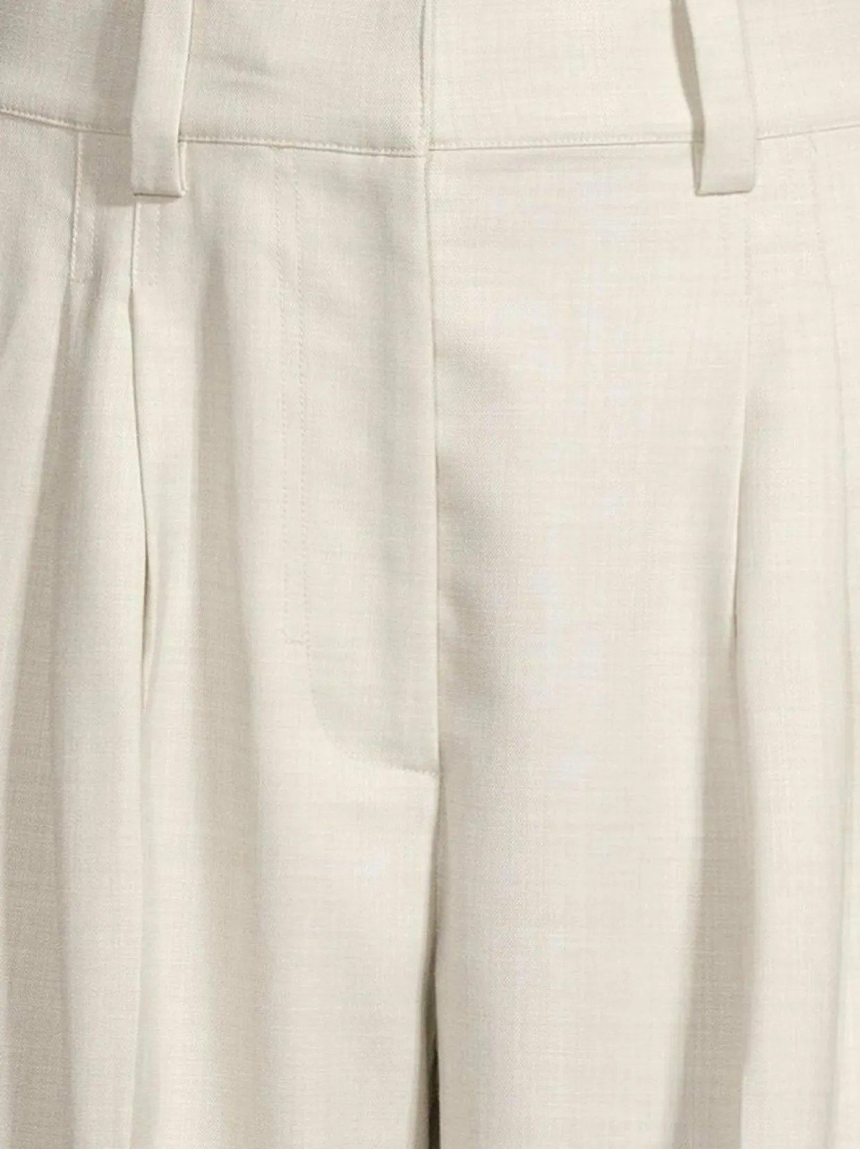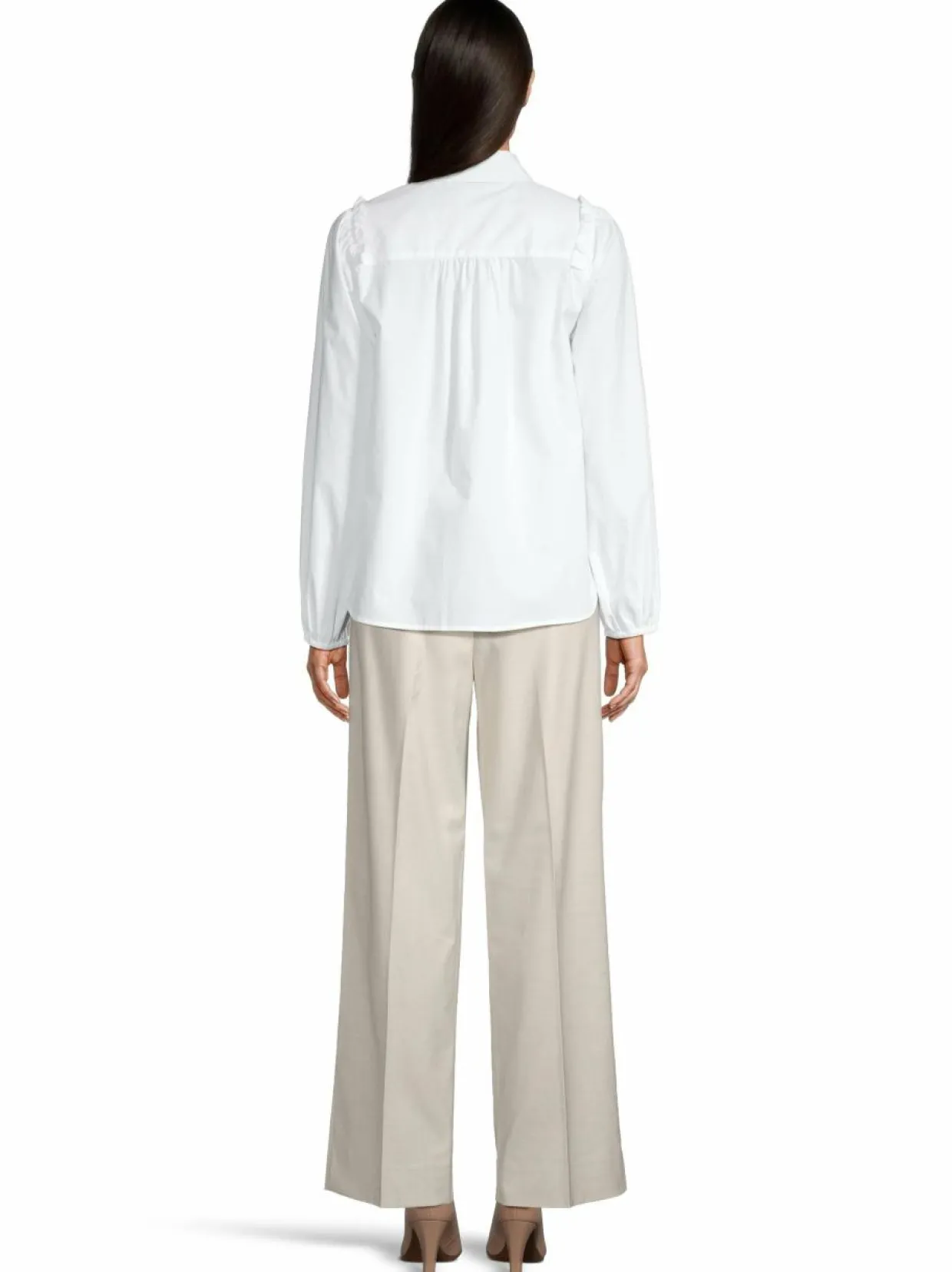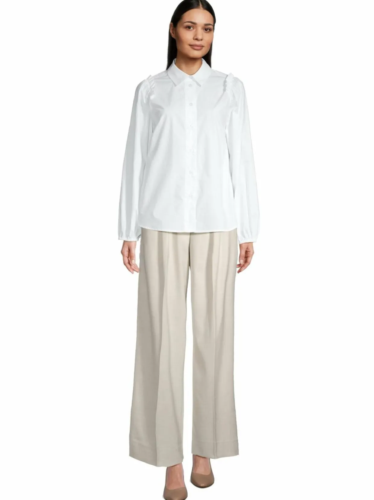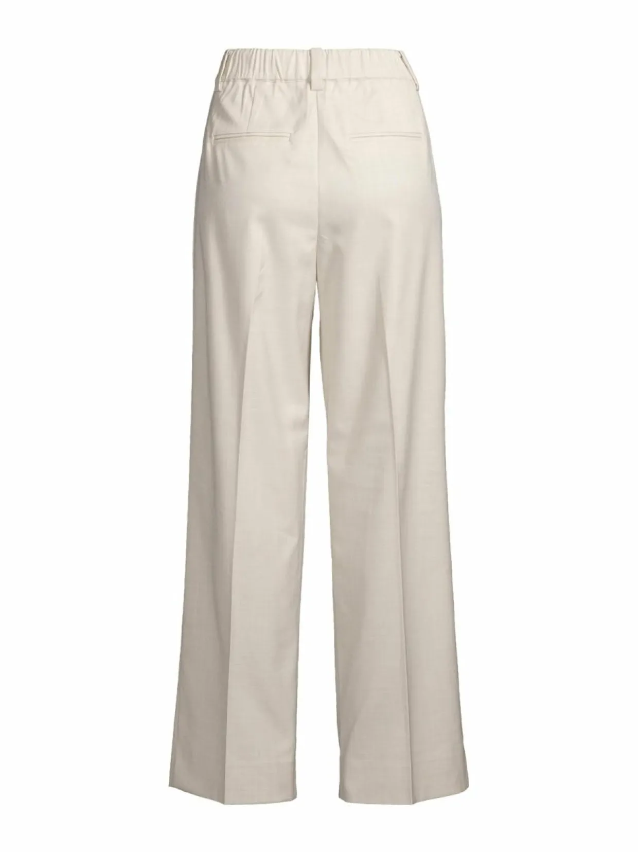 Nämä leveälahkeiset housut on valmistettu pehmeästä ja kevyestä viskoosisekoitteesta. Housuissa on piilovetoketju, koukku- ja nappikiinnitys edessä sekä joustava vyötärö takana. Vyötäröllä on laskokset. Edessä on kaksi viistotaskua ja takana kaksi koristetaskua. Housut istuvat vyötäröltä ja niissä on leveä, suora lahje.