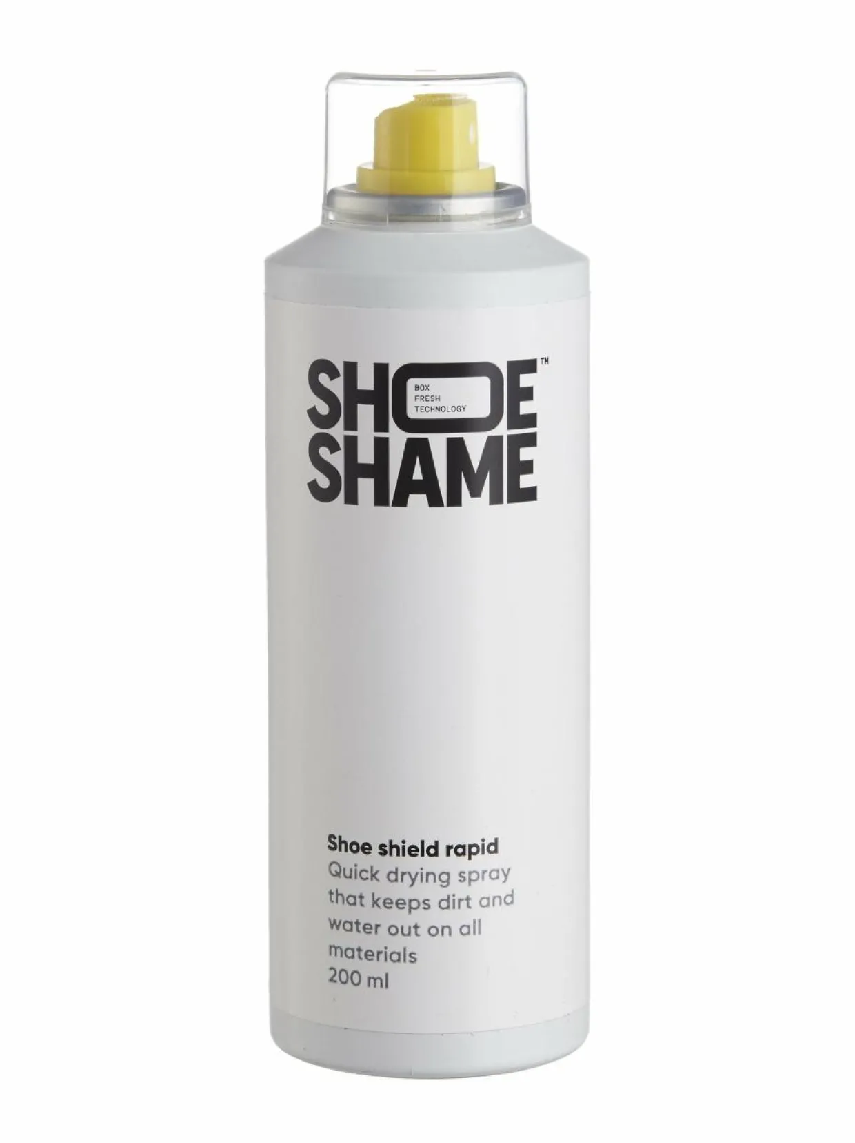 Shoe Shame Shoe Shield Rapid -suojasuihke suojaa kengät tehokkaasti kosteudelta, lialta ja tahroilta. Sopii kaikille materiaaleille ja kuivuu vartissa.