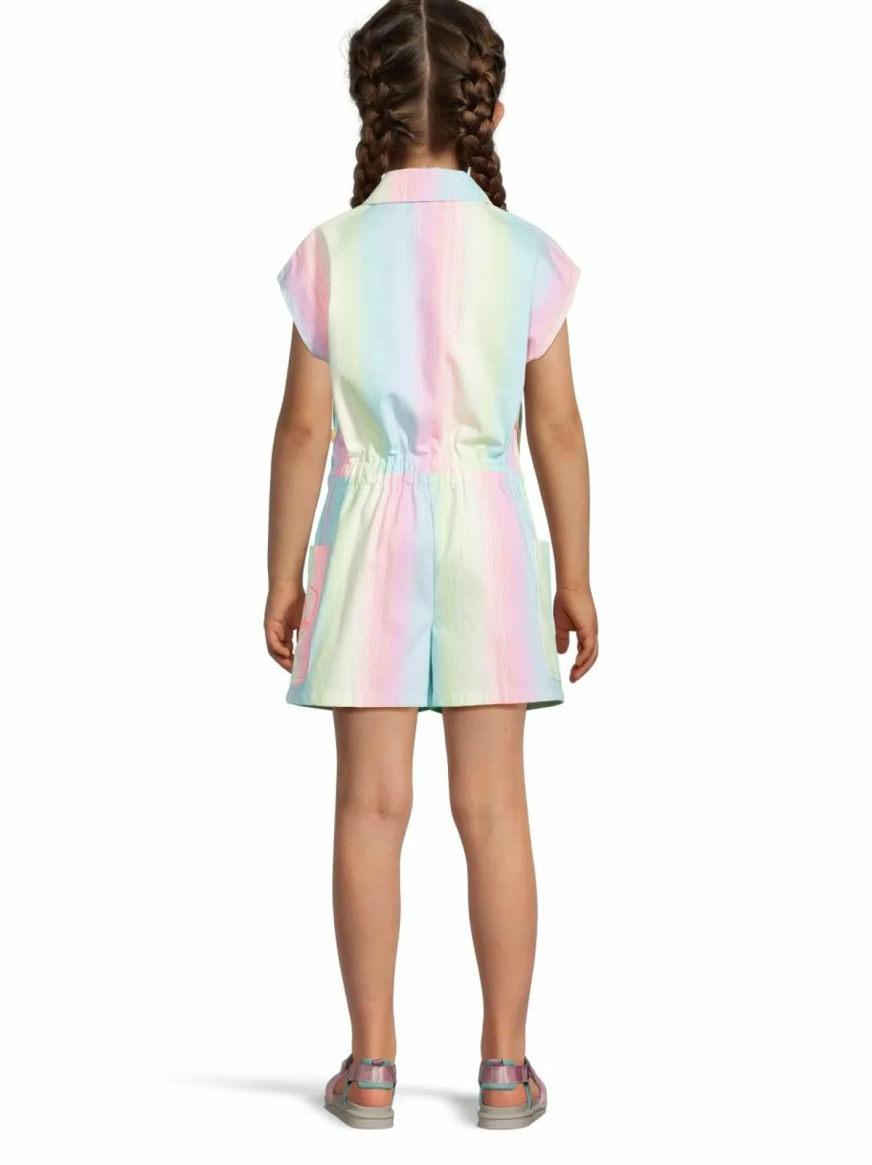 Billieblushin shortsihaalari on valmistettu pehmeästä puuvillasekoitteesta ja siinä on värikäs, raidallinen kuosi. Haalarissa on lyhyet hihat, paitakaulus ja napit edessä. Vyötäröllä on kuminauha ja lahkeissa taskut. Yhtä taskua koristaa kuvitus.