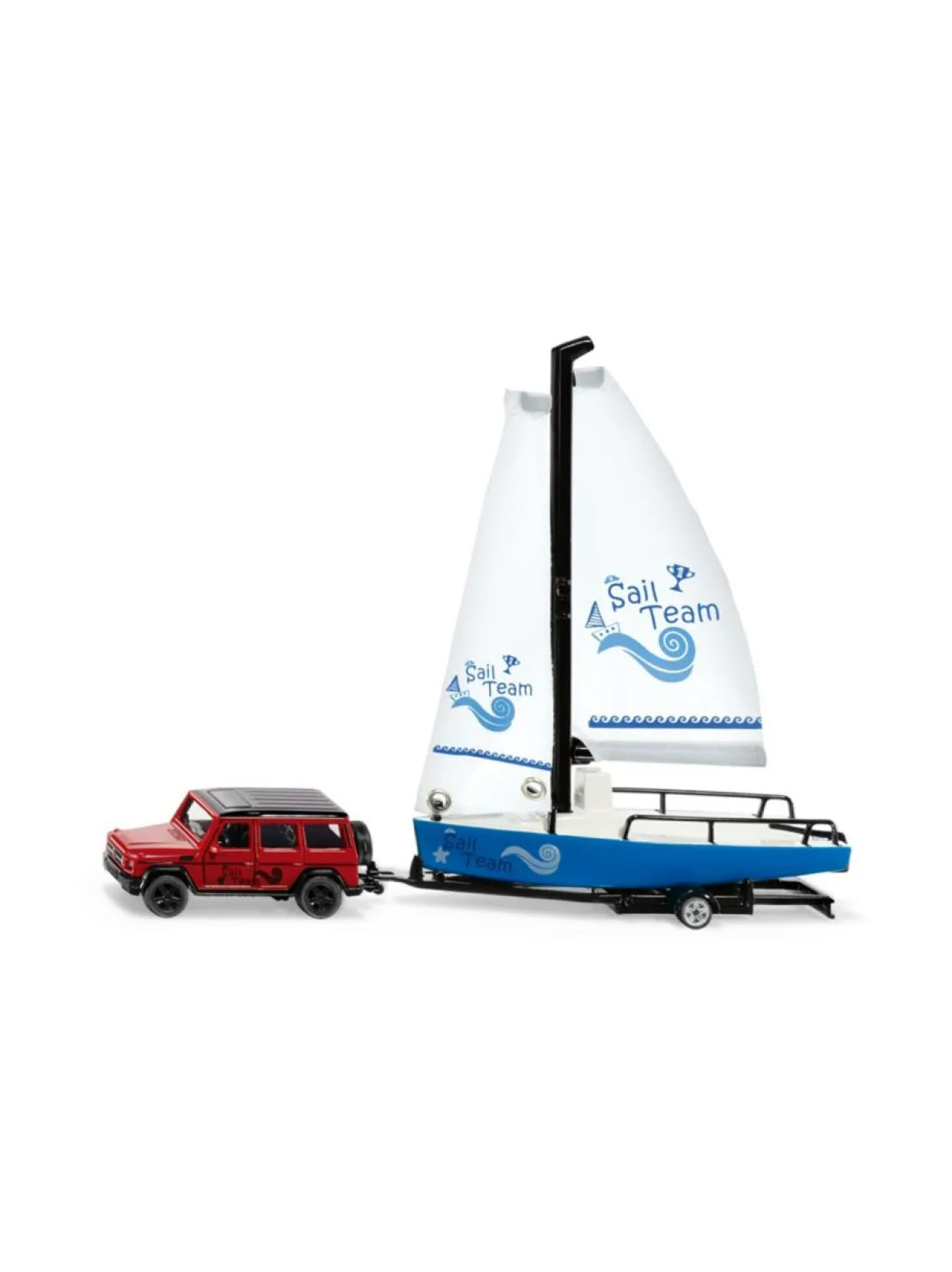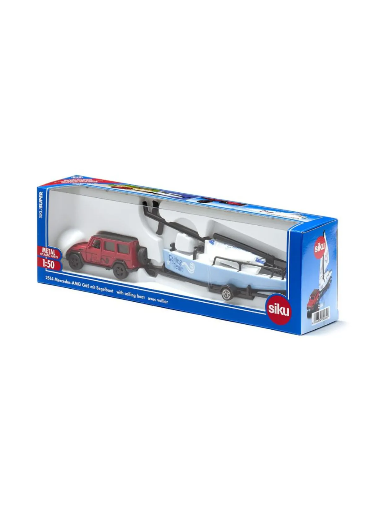 SIKU Mercedes AMG G65 -maastoauto ja traileri purjeveneellä, 1:50, 27,9 cm