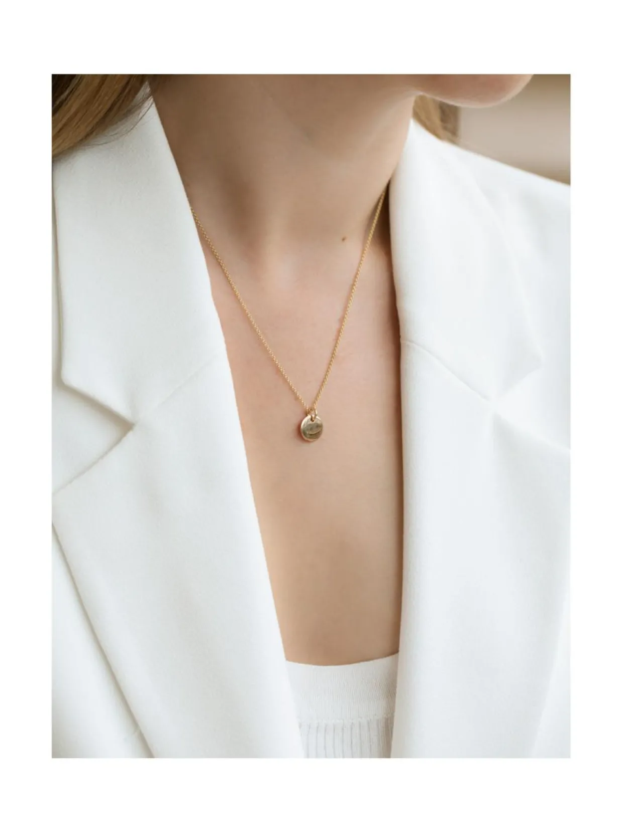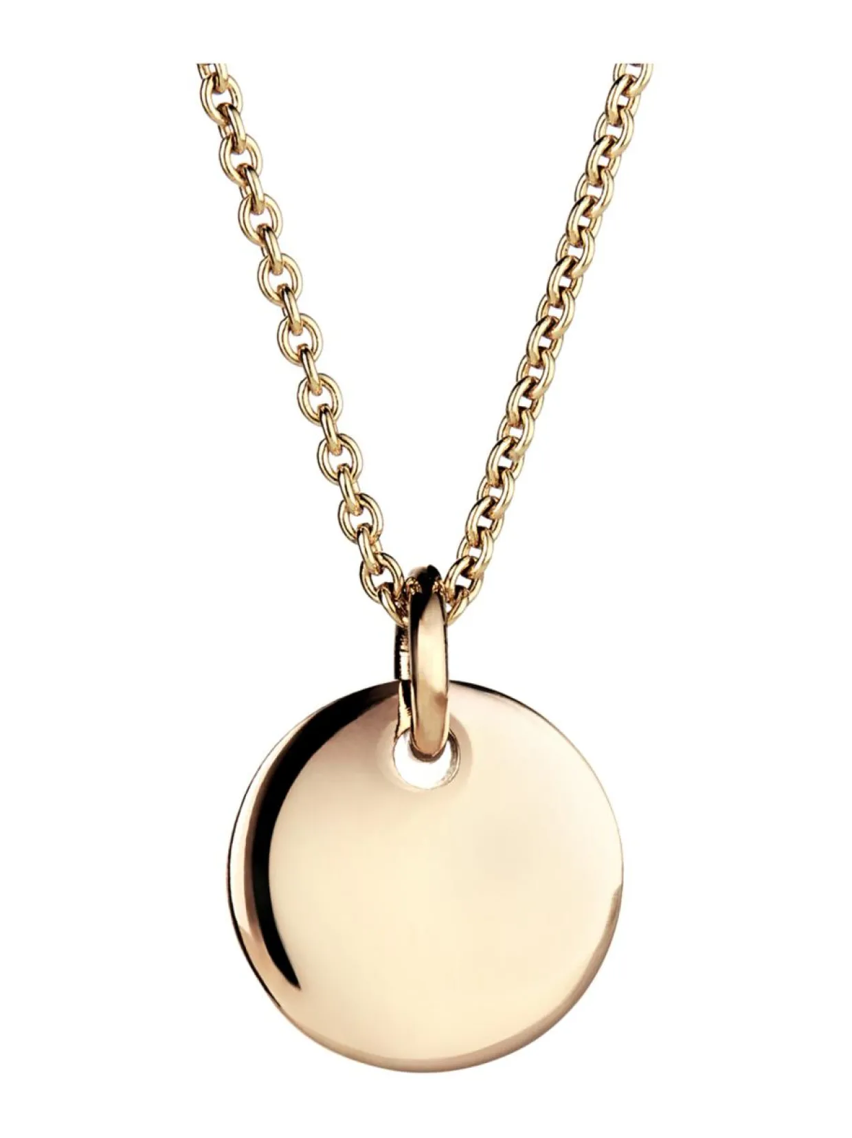 Sileä laattakaulakoru on aina trendikäs klassikko, jonka suosiolle ei näy loppua. Pyöreän laatan halkaisija on 9mm ja se on 14 karaatin kierrätyskultaa. Soikea kiinnityslenkki pitää riipuksen tukevasti kiinni ketjussa.