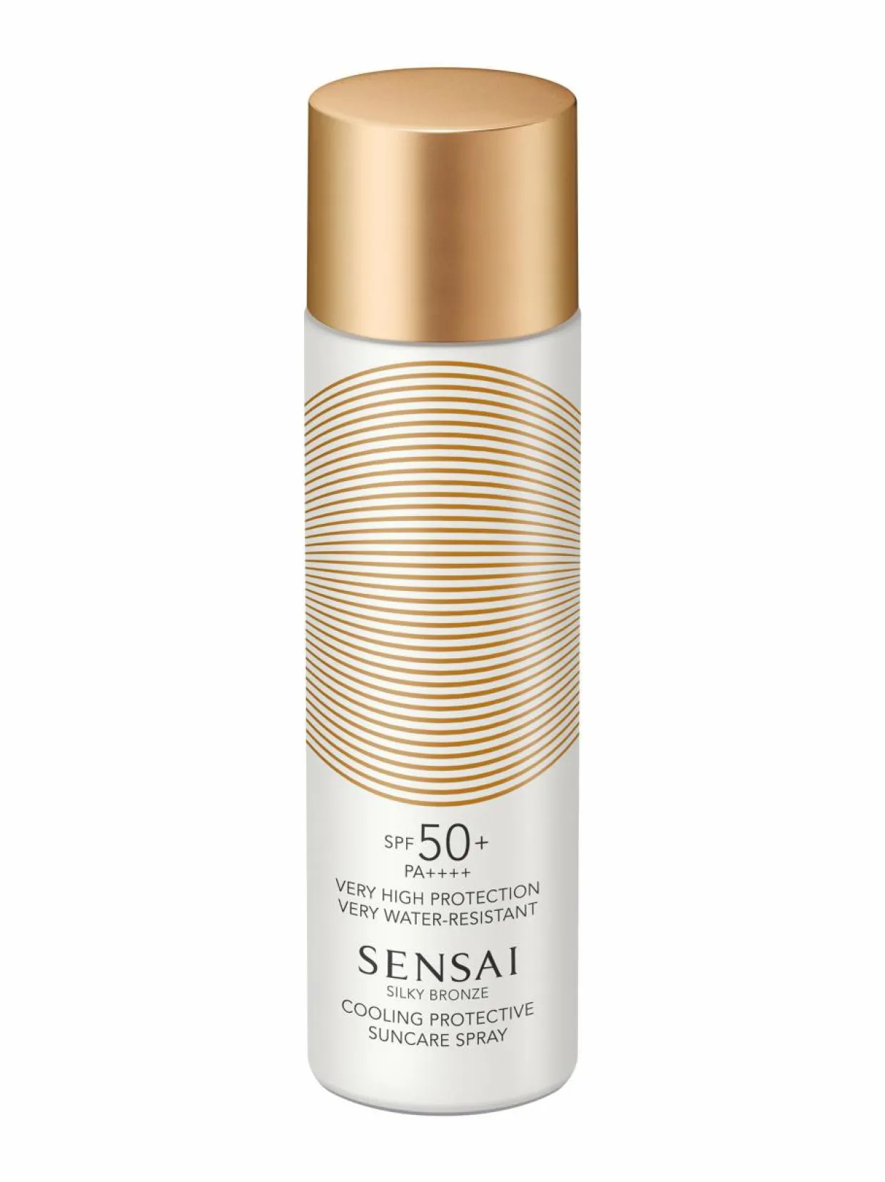 Sensai Silky Bronze Cooling Protective Suncare Spray for Face and Body on uudenlainen aurinkosuojasuihke kasvoille ja vartalolle. Se antaa iholle virkistävän tunteen, tasaista suojaa UV-säteitä vastaan ja luo silkkisen tunteen iholle. Suihke viilentää ihoa 3 astetta heti suihkutettaessa. Suihkutuksen jälkeen iholle jää vain mikro-geeliöljy, joka suojaa ihoa UV-säteiltä ja luo kauniin hehkun iholle. Näkymätön ja tahraamaton koostumus levittyy tasaisesti ja antaa SPF 50+ -suojan. Hemmotteleva persikkainen tuoksu on miellyttävä. Anti-ageing hoidollisuus: Koishimaru Silk EX ja Sun Anti-Aging Care Complex suojaavat ihoa auringon ennakkoon vanhentavilta vaikutuksilta. Pullo on aerosolipullo.