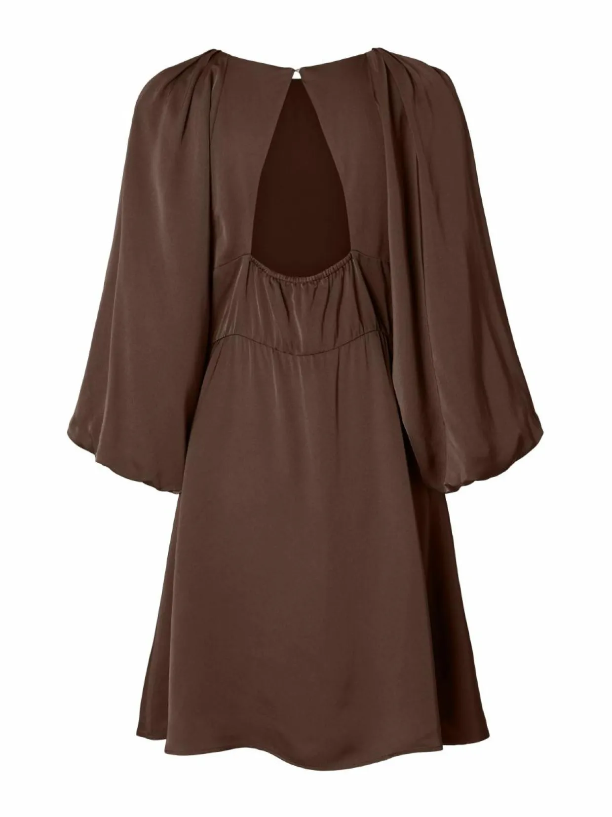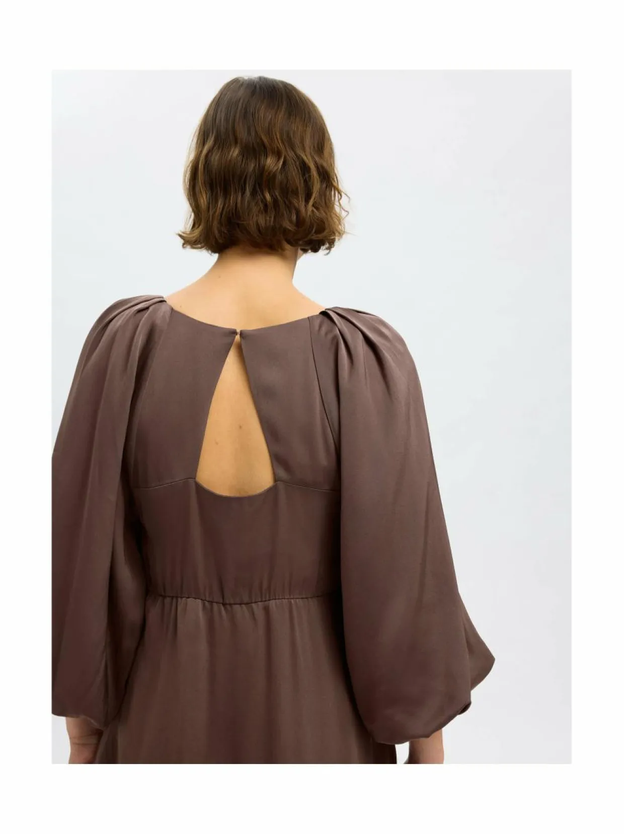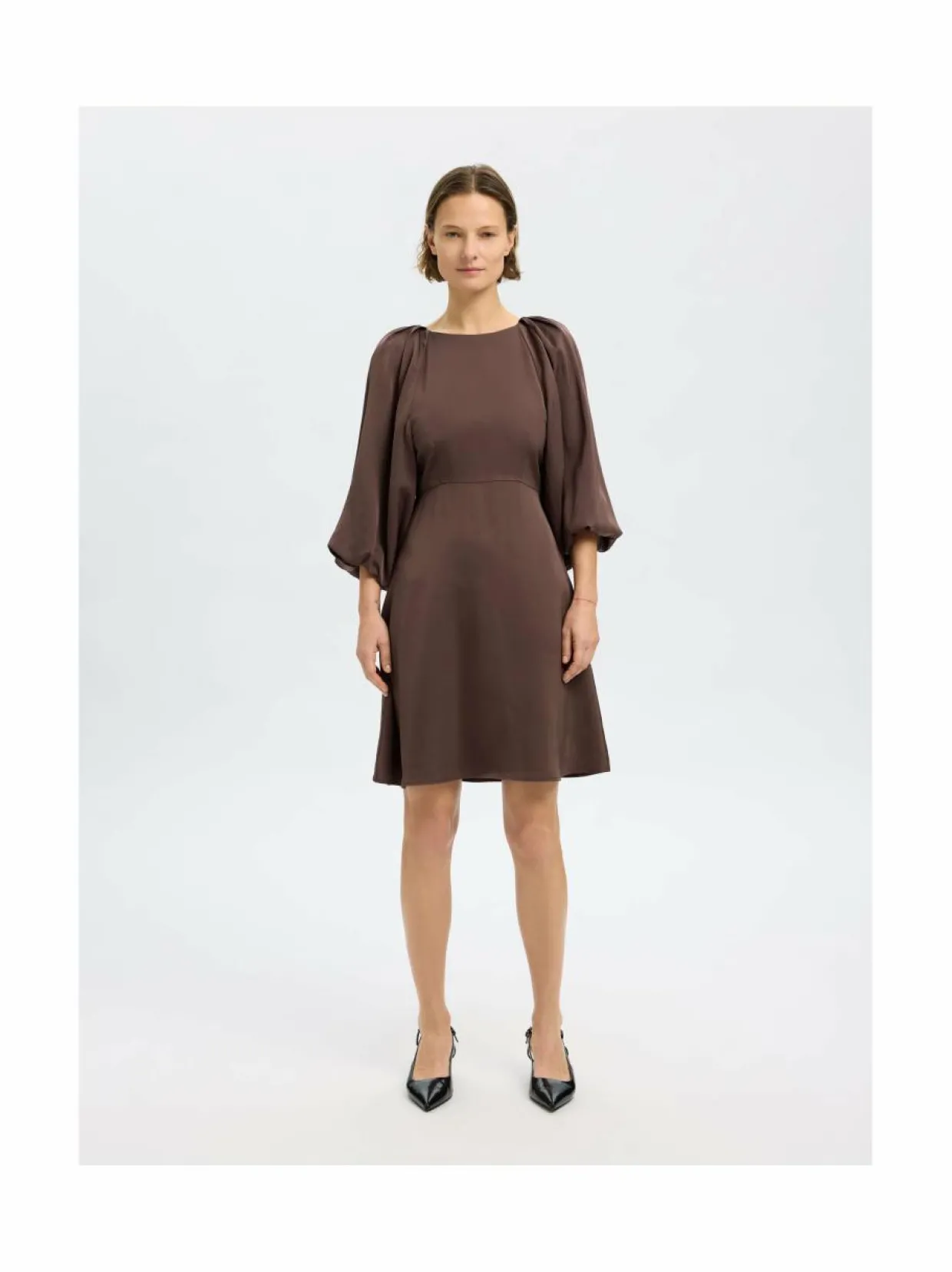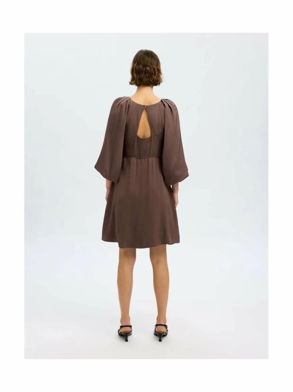 Eleganteilla 3/4-pituisilla puhvihihoilla ja avoimella selkäosalla suunniteltu lyhyt mekko Selected vaatemerkiltä. SlfLaurina-mekon yläosa on tyköistuva, sen helma on A-linjainen. Mekko on valmistettu silkkimäisen pehmeästä viskoosista.