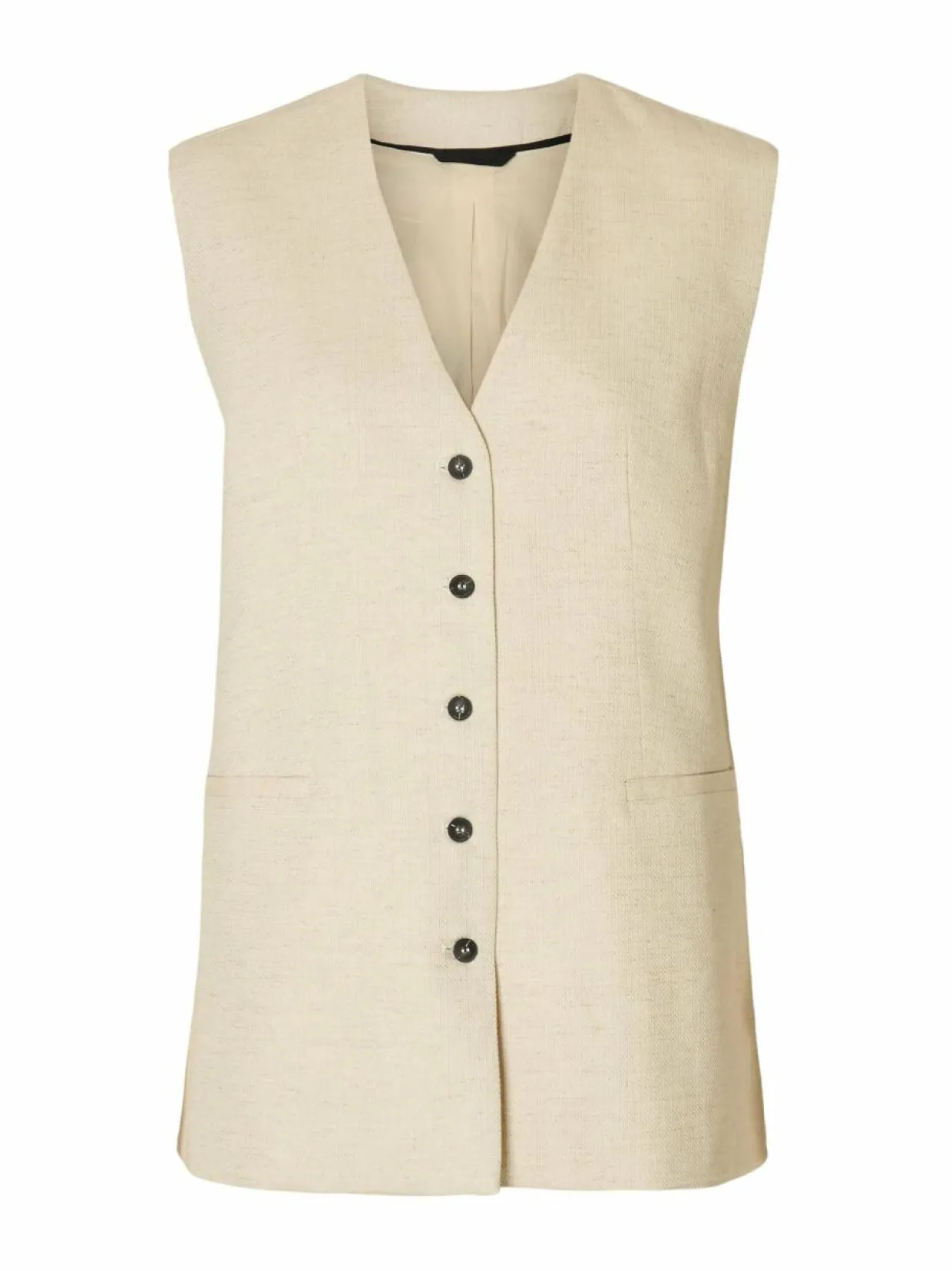 Lantion alapuolelle ulottuva pidempi V-kauluksinen liivi Selected vaatemerkiltä. Pukuliivi sopii käyttöön sellaisenaan tai kerrospukeutumiseen. Materiaalina on käytetty hengittävää ja miellyttävän tuntuista puuvilla-pellavaa. Tuote sisältää vähintään 50 % luomupuuvillaa.