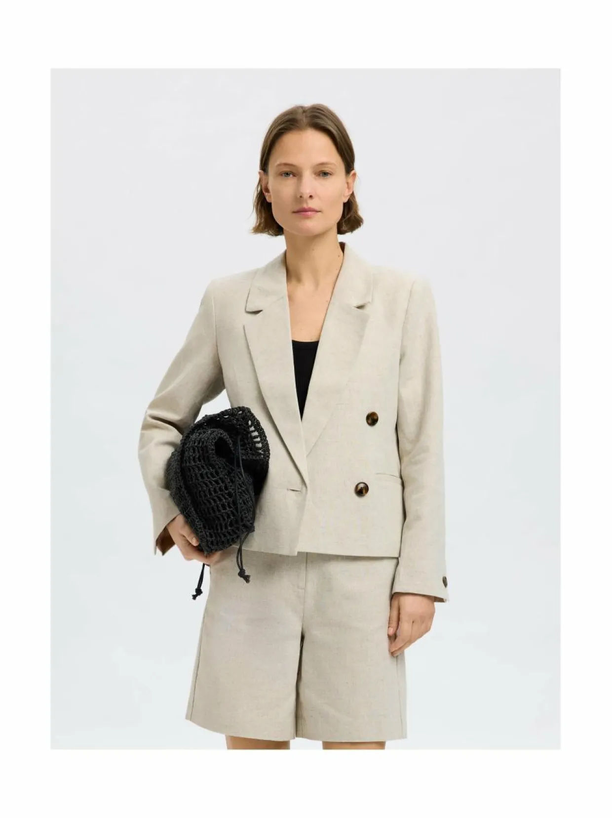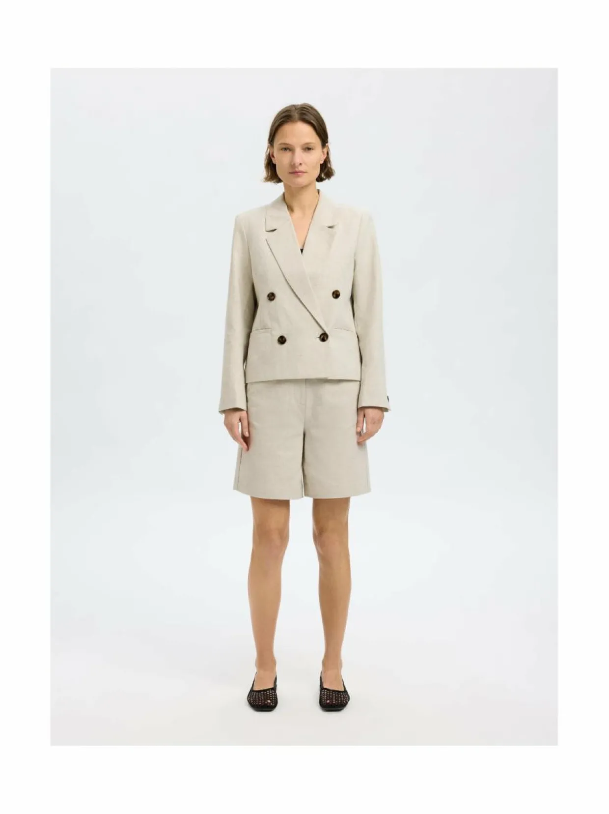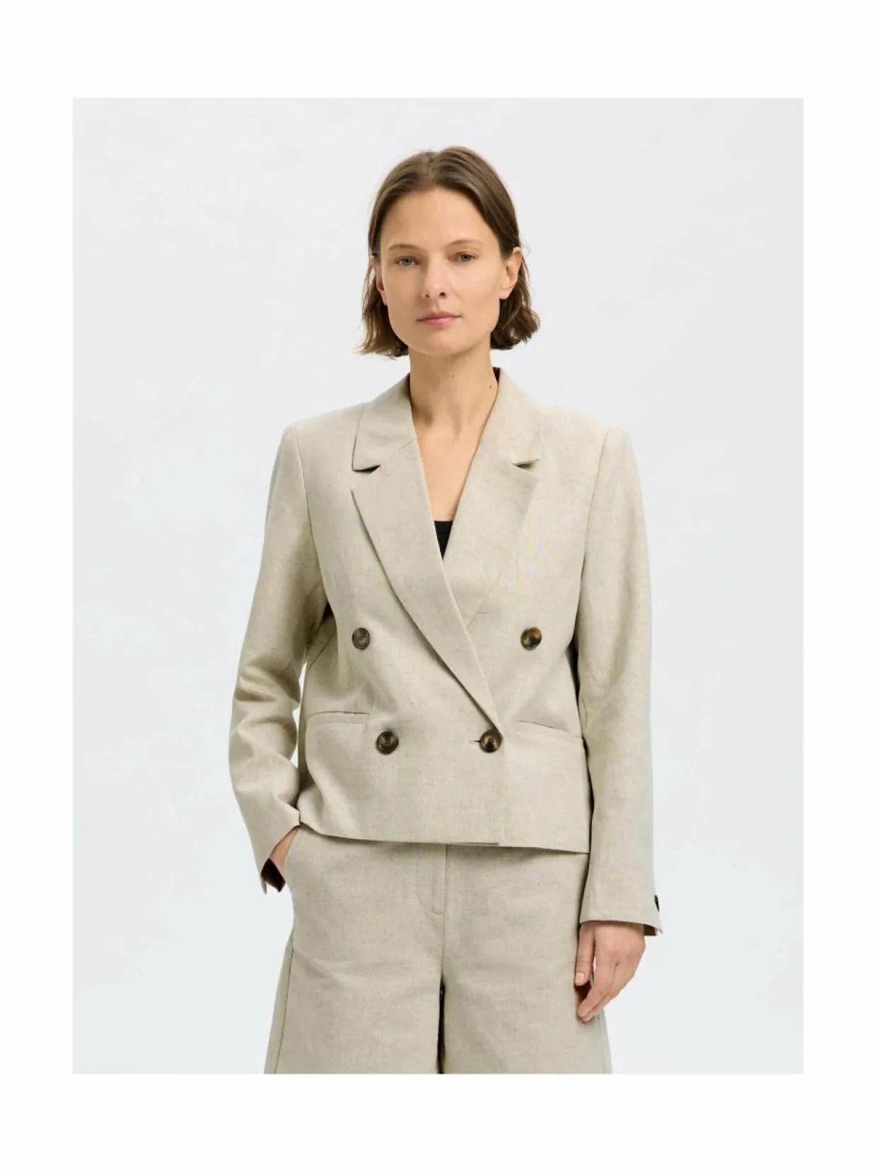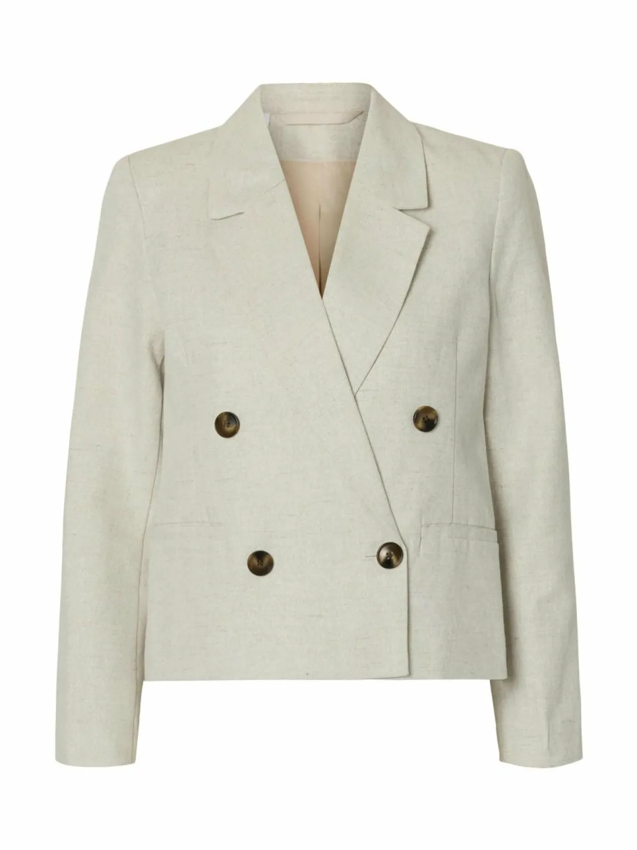 Rento ja trendikäs jakku, jossa on käännekaulus, taskut sekä kaksirivinen napitus. Tämä lyhyt bleiseri sopii erinomaisesti sekä arkikäyttöön että juhliin. Materiaalina on käytetty hengittävää ja miellyttävän tuntuista puuvilla-pellavaa.