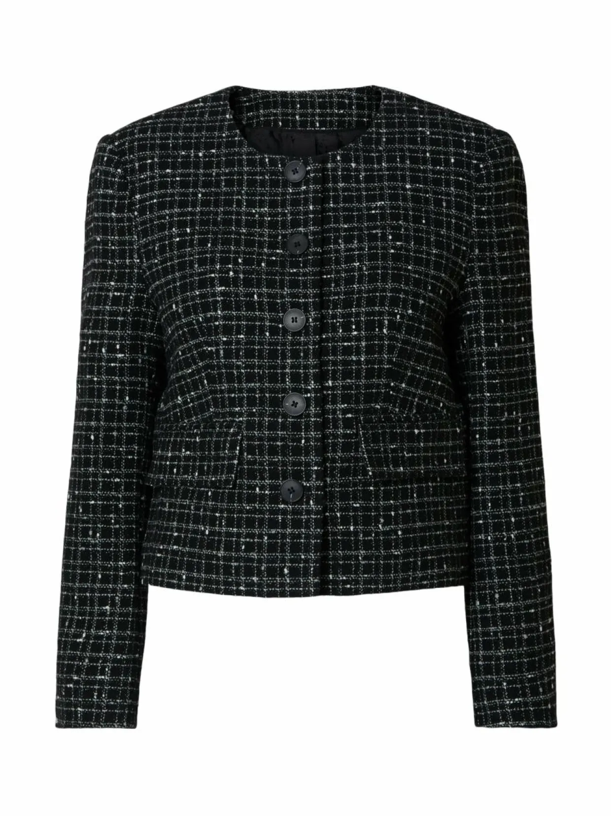 Selected merkin bukleepintainen bleiseri on elegantti valinta niin arkeen kuin juhlaan. Materiaaliin on lisätty myös lämmittävää villaa. Edessä napitus ja taskut. Lyhyt irtotakki sopii hyvin yhdistettäväksi sekä housujen että hameen kanssa.