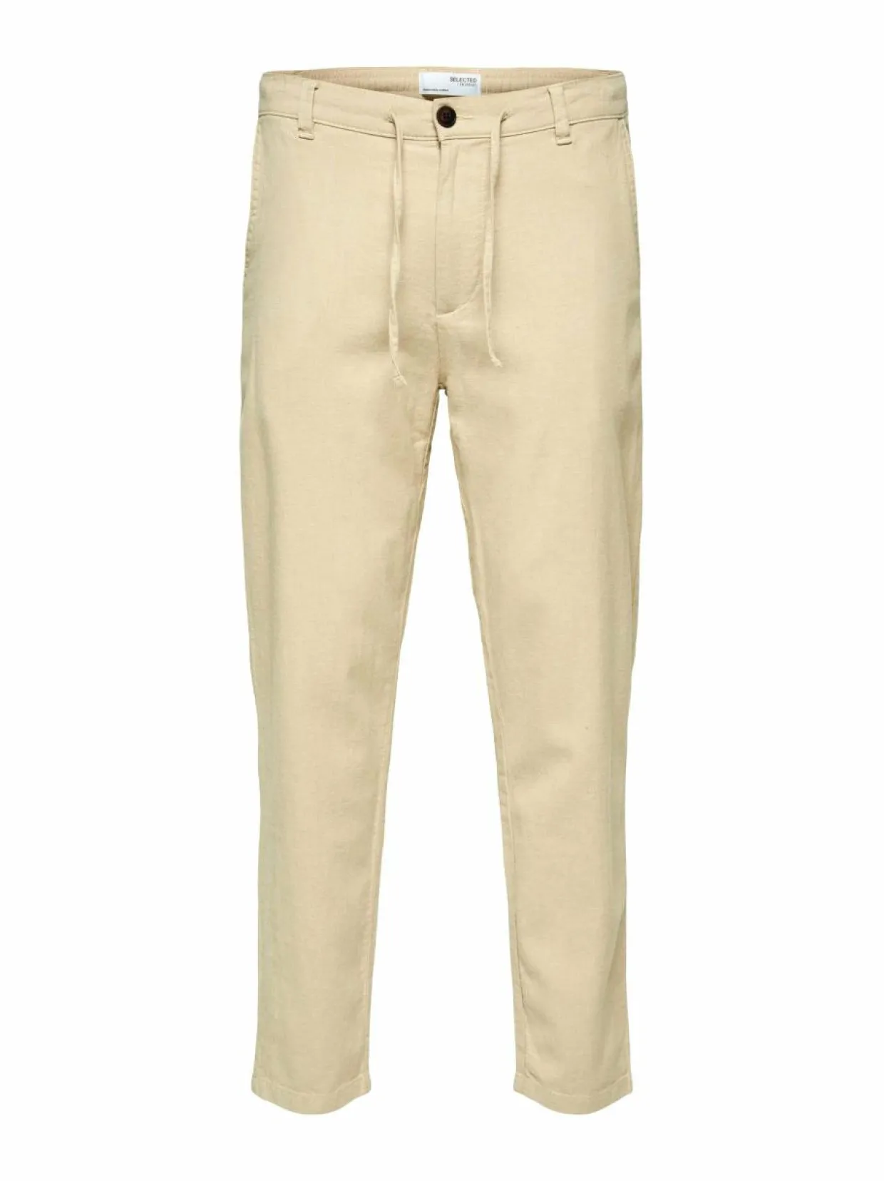 Selected merkin Brody-housut on valmistettu hienosta materiaaliyhdistelmästä, johon kuuluu ihoystävällistä luomupuuvillaa ja hengittävää pellavaa. Rentoon tyyliin sopivissa housuissa on sivutaskut ja listataskut takana. Edessä nappi- ja vetoketjusepalus. Vyötärökaitaleelta löytyvät vyölenkit. Tämän housumallin lahkeet ovat kapenevat.