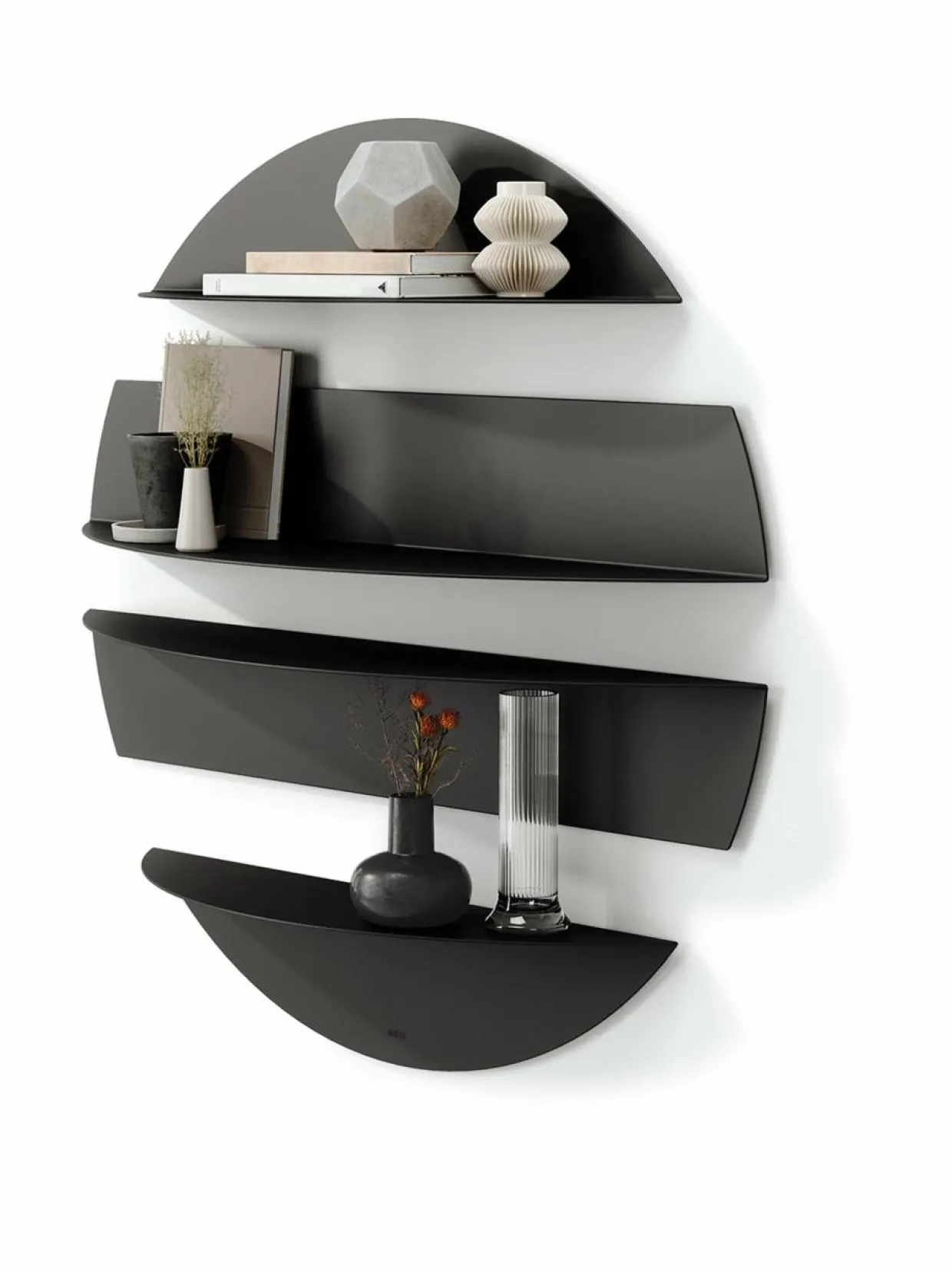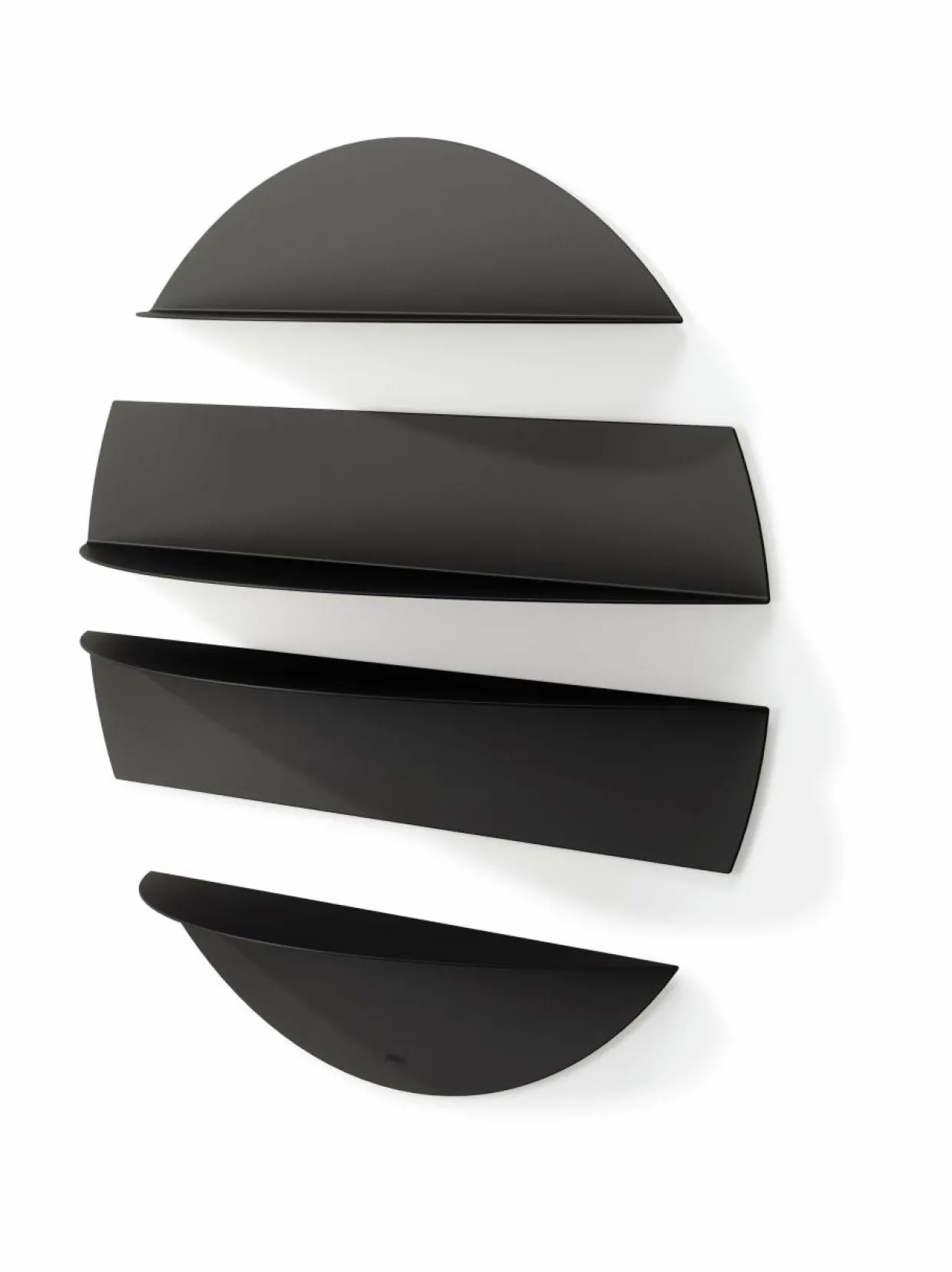 Tämä Umbran neljän ainutlaatuisen seinähyllyn kokonaisuus on valmistettu taivutetusta metallista, ja niitä voidaan käyttää yhdessä luomaan upea pyöreänmallinen seinäteline, joka toimii myös säilytystilana.Se koostuu kahdesta suuresta ja kahdesta pienemmästä hyllystä, ja jokainen hylly voidaan asentaa erikseen tai sijoittaa yhteen. Jokainen hylly voidaan asentaa myös siten, että hyllypinta on ylöspäin tai alaspäin. Käytä Solis Shelves -seinähyllykkö esittelemään tai säilyttämään kirjoja, koriste-esineitä, kynttilöitä, kuvakehyksiä tai muita tyyliisi sopivia elementtejä.