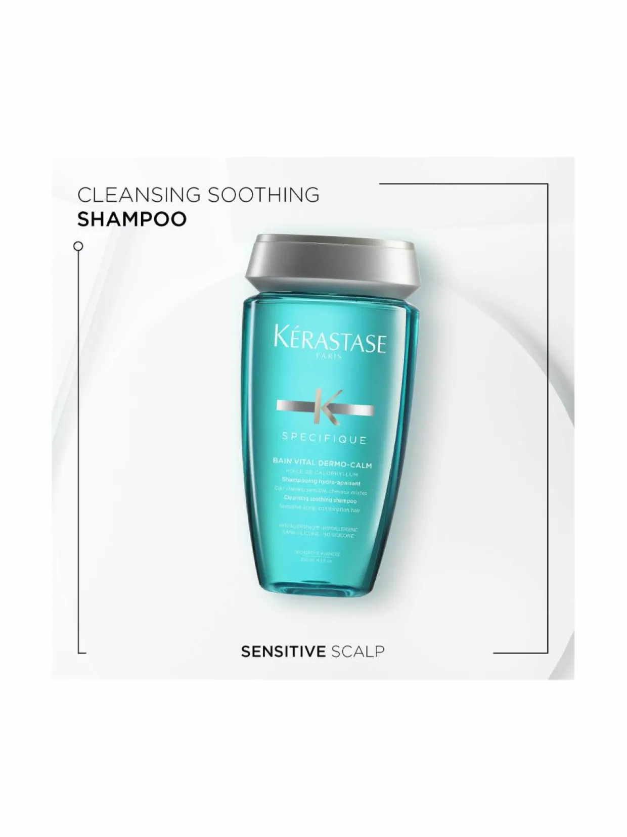 Kérastase Shampoo, joka keskittyy kutisevan ja herkän hiuspohjan syihin. Bain Vital Dermo-Calm poistaa epäpuhtauksia hiuspohjasta ja lievittää tulehduksia sekä rauhoittaa ja kosteuttaa hiuspohjaa antaen rentouttavan tunteen.