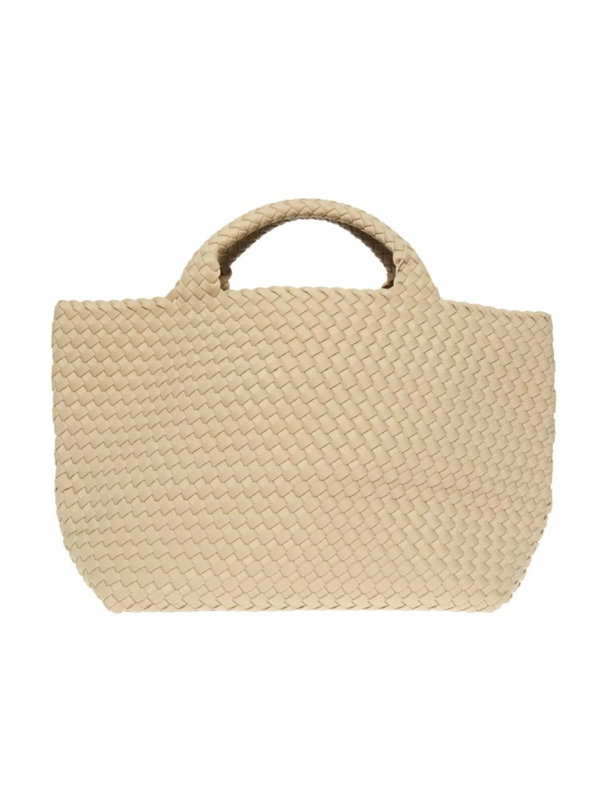 Keskikokoinen Naghedi-merkin käsinkudottu St Barths Medium Tote -laukku on kevyt ja monipuolinen klassikkolaukku, joka on ihanteellinen arkeen tai vaikka viikonlopun matkalle. Laukussa on kaksi kantokahvaa, jotka joustavat hieman ja mukautuvat pehmeästi olkapäälle. Tämä laukku on tehty käsityönä ja tästä syystä pienet sävyerot ovat mahdollisia.