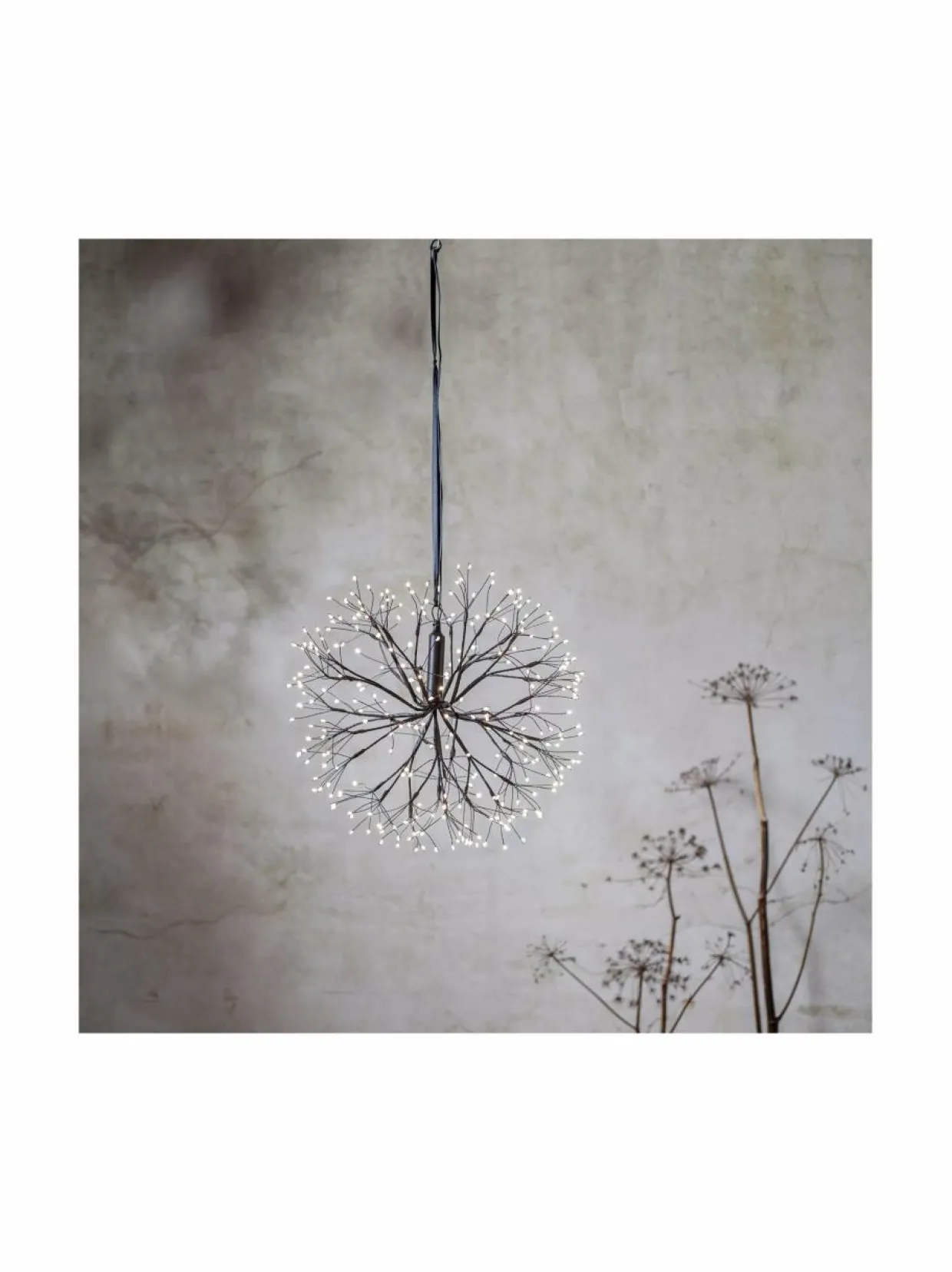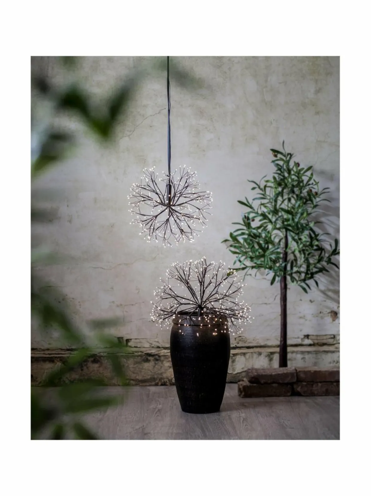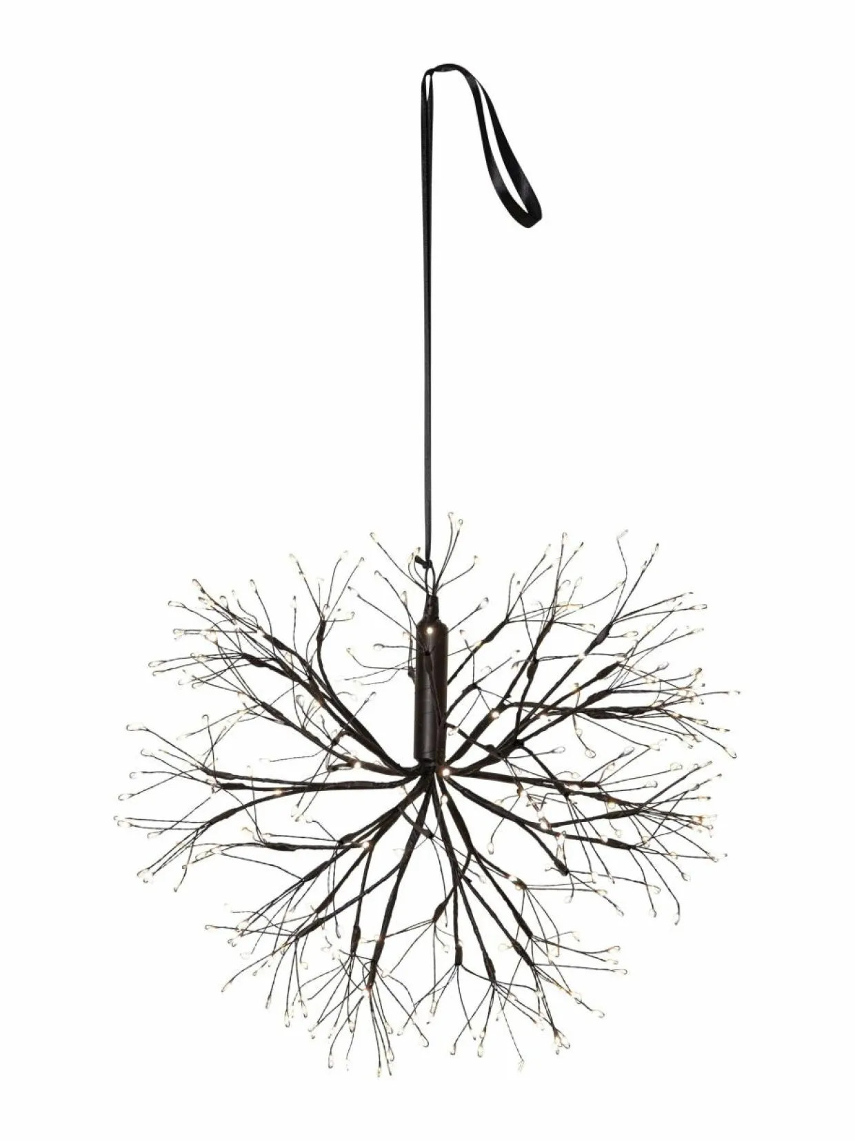 Ulko- ja sisäkäyttöön sopiva koriste, jonka voi joko ripustaa roikkumaan tai asettaa esimerkiksi ruukkuun. Koristeessa on 16 muotoiltavaa oksaa, ja niissä 288 lämpimän valkoista LED-valopistettä. Koristeessa on myös ajastintoiminto, jonka avulla valot palavat 6 tunnin ajan kerrallaan ja syttyvät seuraavana päivänä samaan aikaan uudelleen. Johdon pituus 500 cm. Halkaisija 40 cm. Kiinteä LED, lamppuja ei voi vaihtaa. Lamppujen paloaika n. 7 000 tuntia. Energialuokka G.