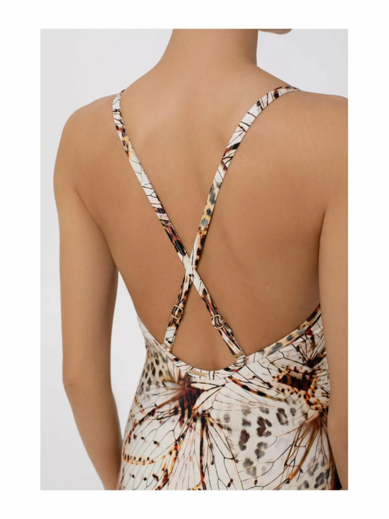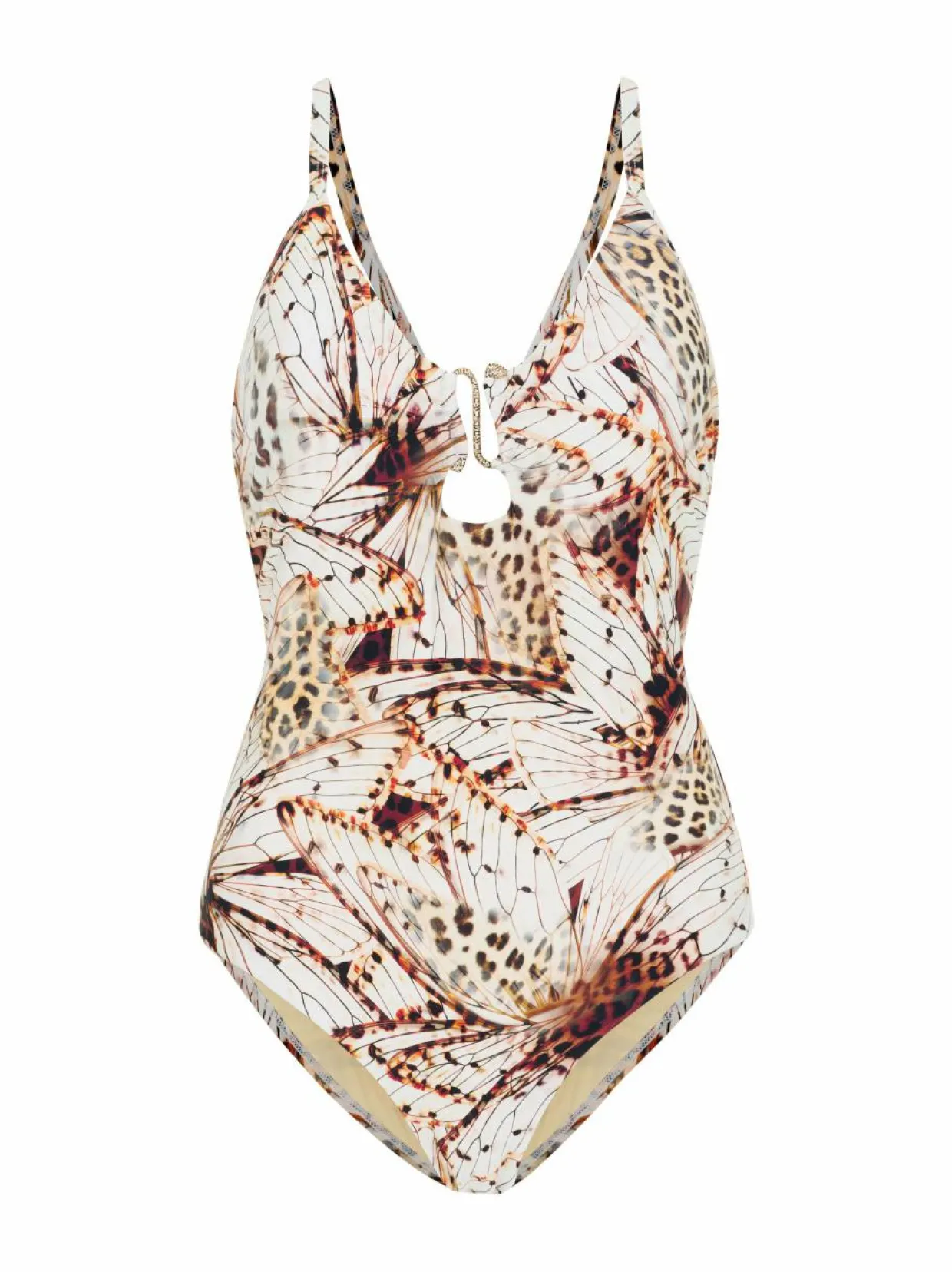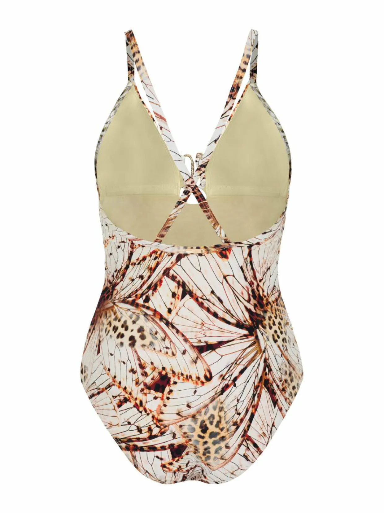 Marc & Andrén kaarituettomassa Stay Wild -uimapuvussa on edessä V-mallinen ja takana selän paljastava leikkaus. Olkaimet ovat säädettävät. Uimapukua koristaa eloisa printti sekä metallinen koriste edessä. Malli on kokonaan vuorattu ja sen lahkeensuiden leveys on normaali.