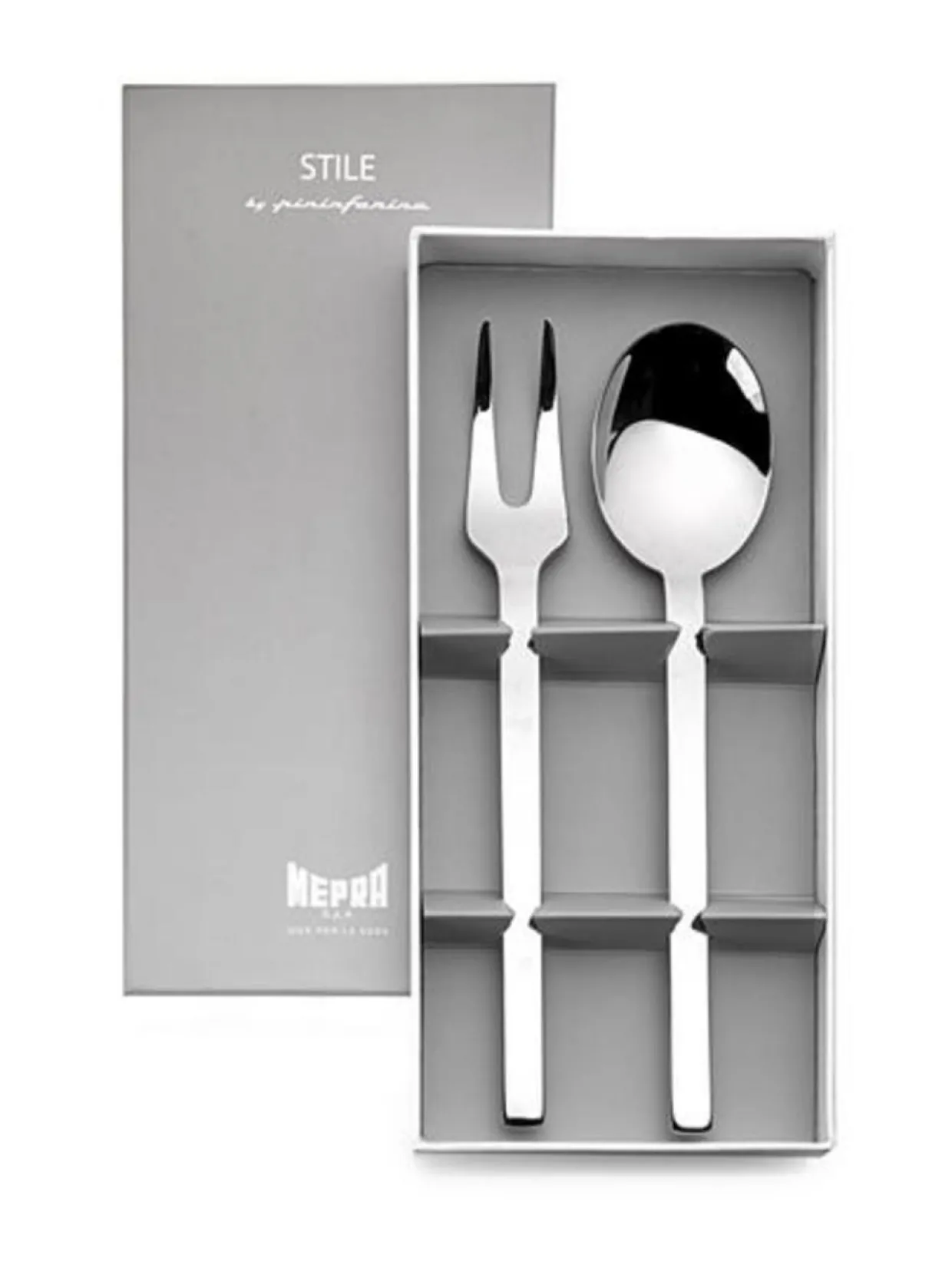 Kuuluisan italialaisen automuotoilijan Pininfarinan suunnittelema Stile-sarja on sekä ajaton että moderni. Good Design Award 2019 ja Red Dot Award 2018 -voittaja. Tarjoiluhaarukan ja -lusikan materiaali on konepesunkestävää ruostumatonta terästä ja ne on pakattu kauniiseen lahjalaatikkoon.