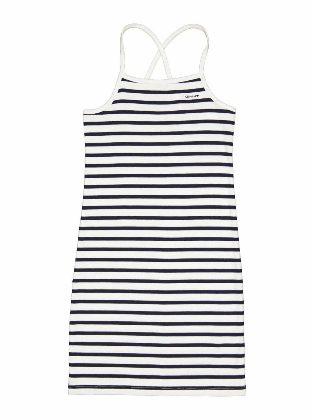 Tyköistuva trikoomekko merihenkisessä raitakuosissa. Hihaton GANT merkin Striped Tank -mekko on mukavan joustavaa laatua ja valmistettu pehmeästä puuvillatrikoosta.