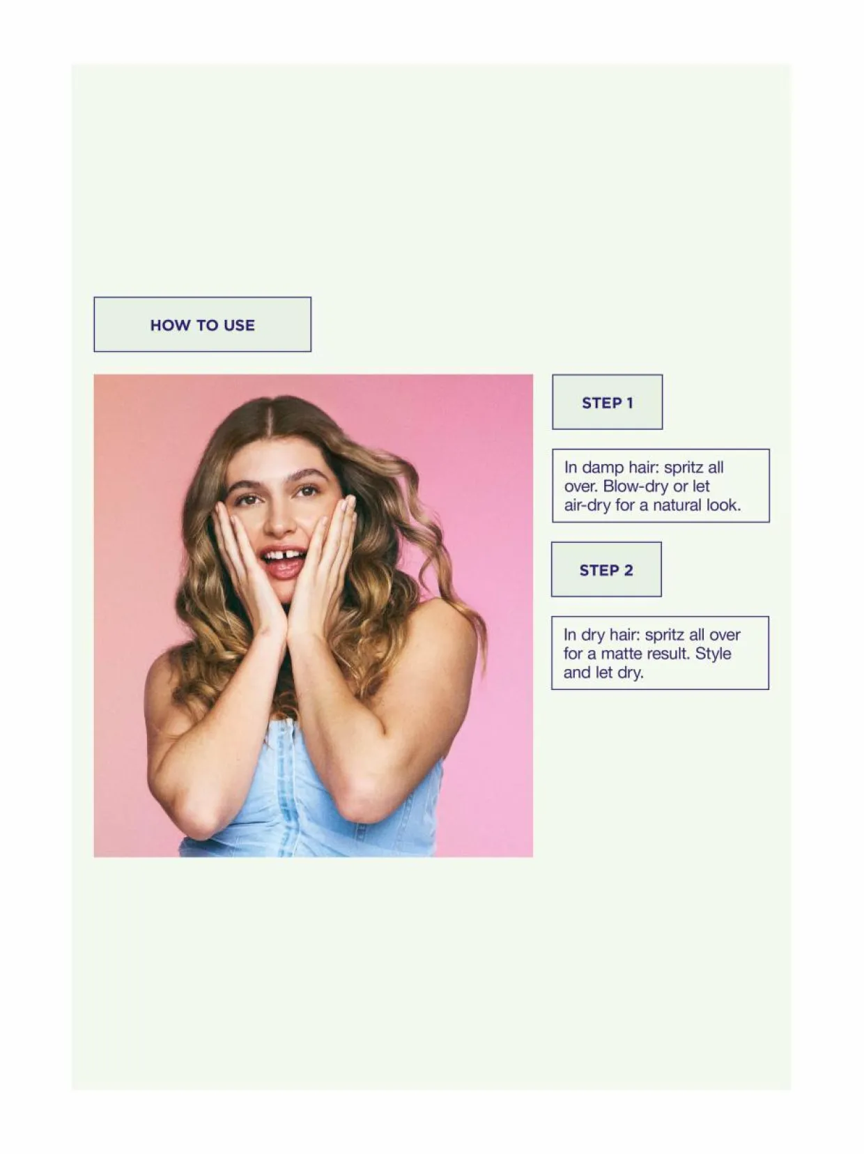 Suihkuta kosteisiin hiuksiin ennen föönausta tai anna hiusten kuivua vapaasti luonnollisen lopputuloksen saamiseksi.Tuotenumero142732814 Pakkauskoko150 ml HiustyyppiNormaalit hiukset VäriNOCOL Koko150 ml