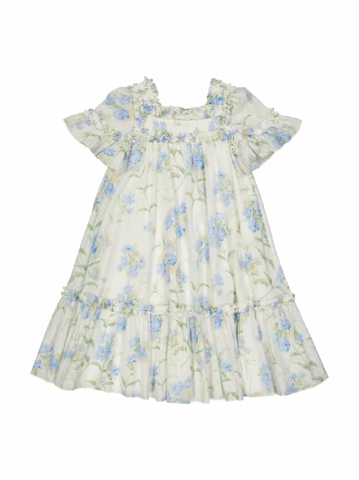Kaunis mekko vintage-kukkakuviolla, joka on otettu 1930-luvun käsinmaalatusta tapetista. Mekossa on lyhyet hihat, rohkeasti levenevä kerrostettu helma ja kauniit röyhelöt. Mekko on vuorattu. Tuotteen valmistuksessa on käytetty luomupuuvillaa.