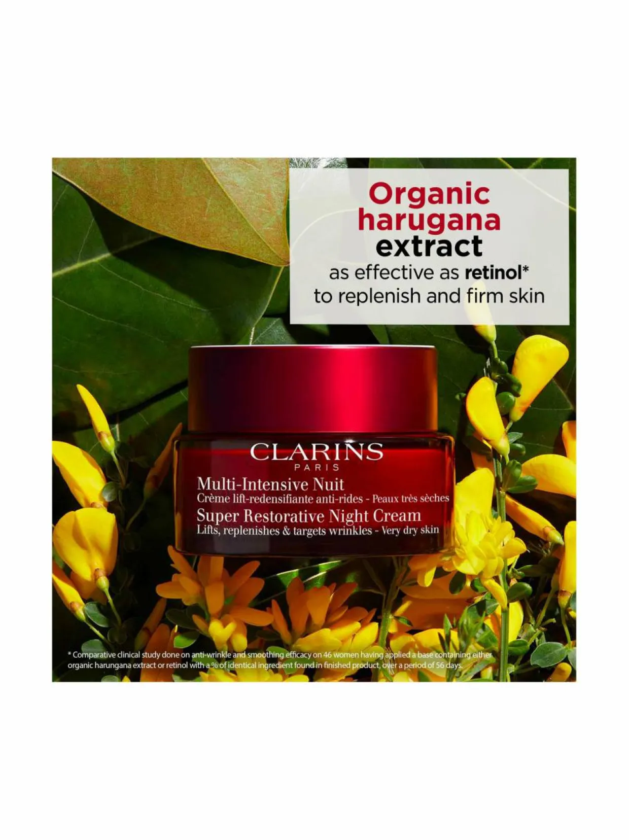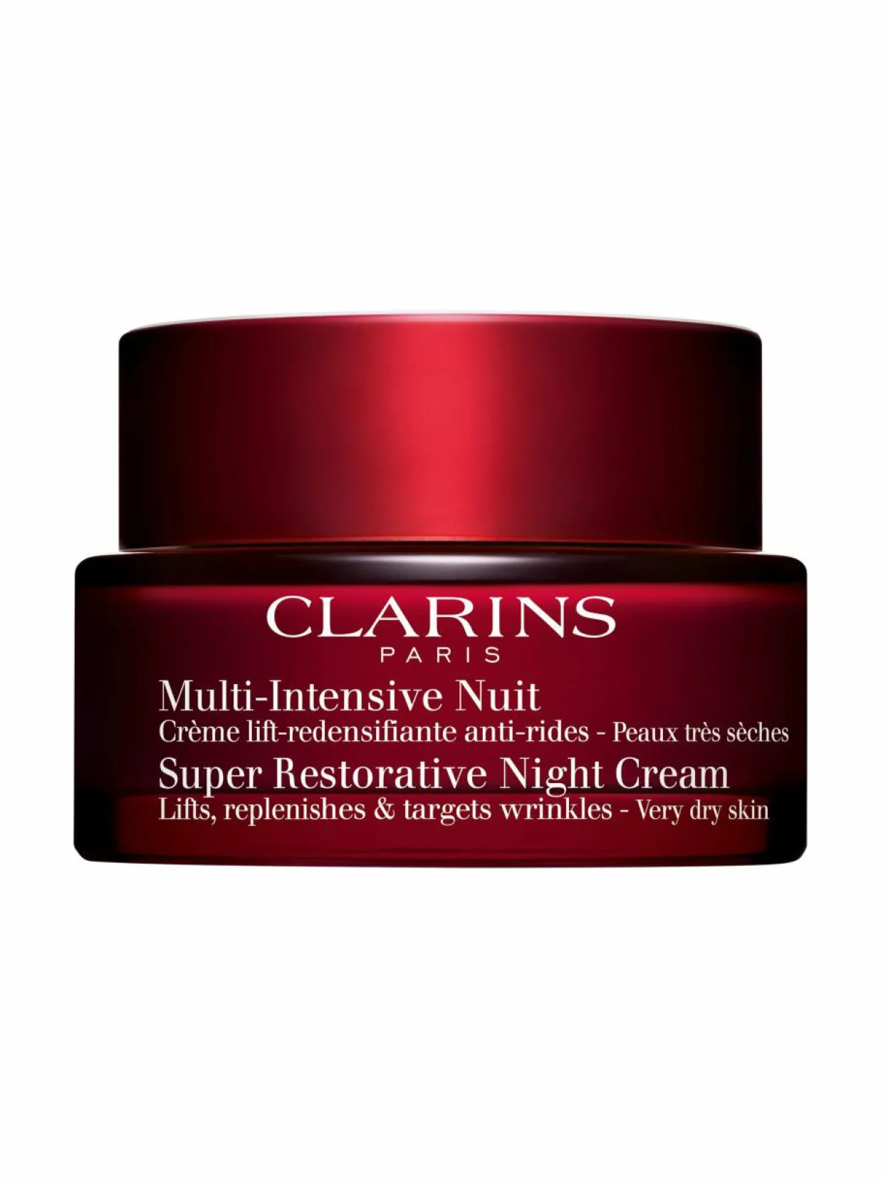 Clarins Super Restorative Night Cream -yövoide kuivalle iholle. Nukkuessa ihon mikroverenkierto hidastuu. Ihon heleyttä parantamaan on Super Restorative -yövoiteisiin lisätty välimerenpihjalapuu-uutetta, joka palauttaa ihon hehkun. Iho on kuin “uudelleen herännyt”, raikas ja säteilevä. Yövoiteen siltämä luomu harunganauute ja piikkiherneuute muodostavat ihoa hoitavan duon, joka uudistaa ja liftaa ihoa.