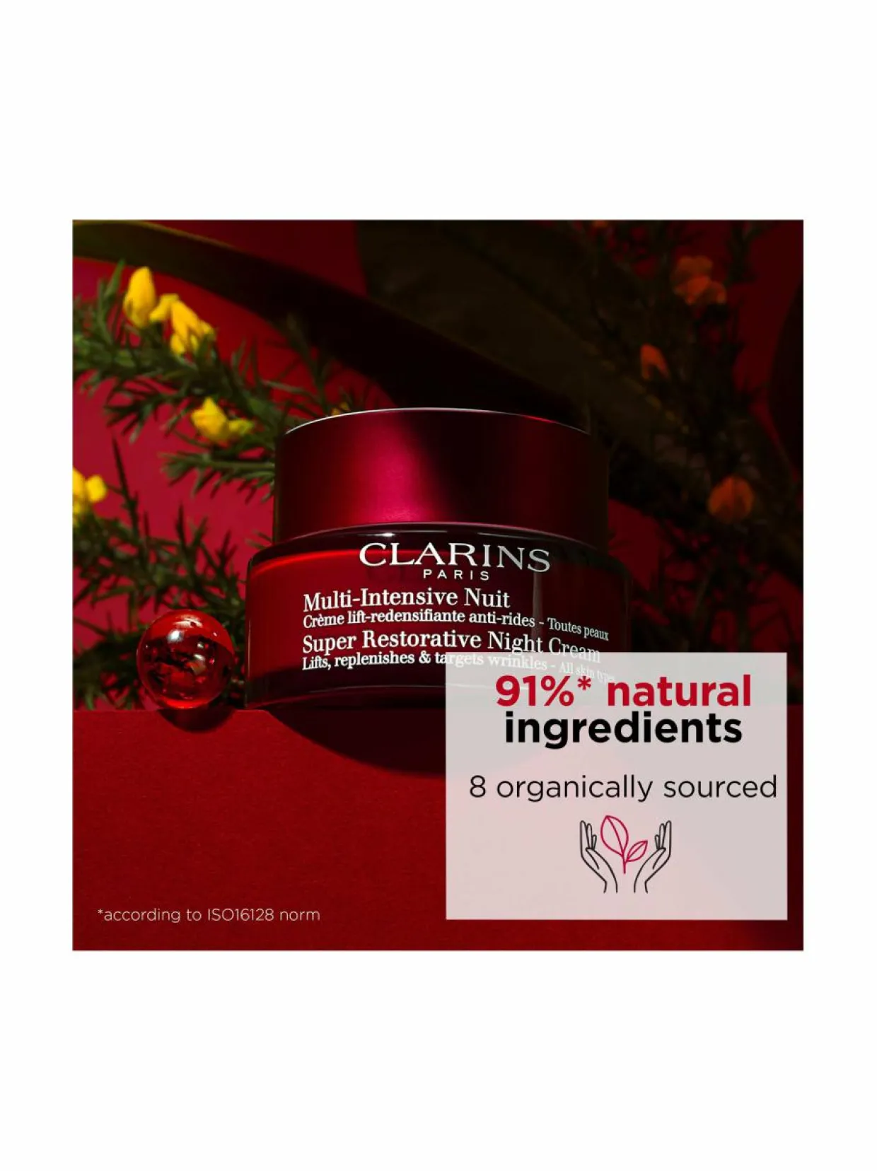 Clarins Super Restorative Night Cream -yövoide kaikille ihotyypeille. Nukkuessa ihon mikroverenkierto hidastuu. Ihon heleyttä parantamaan on Super Restorative -yövoiteisiin lisätty välimerenpihjalapuu-uutetta, joka palauttaa ihon hehkun. Iho on kuin “uudelleen herännyt”, raikas ja säteilevä. Yövoiteen siltämä luomu harunganauute ja piikkiherneuute muodostavat ihoa hoitavan duon, joka uudistaa ja liftaa ihoa.