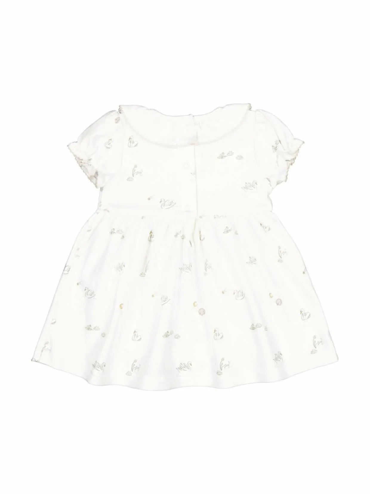 LIVLY:n röyhelökauluksinen mekko perheen pienimmille. Siinä on lyhyet puhvihihat ja painonappikiinnitys takana. Mekko on valmistettu hypoallergeenisesta ja pehmeästä Pima-puuvillasta mukavalla istuvuudella.