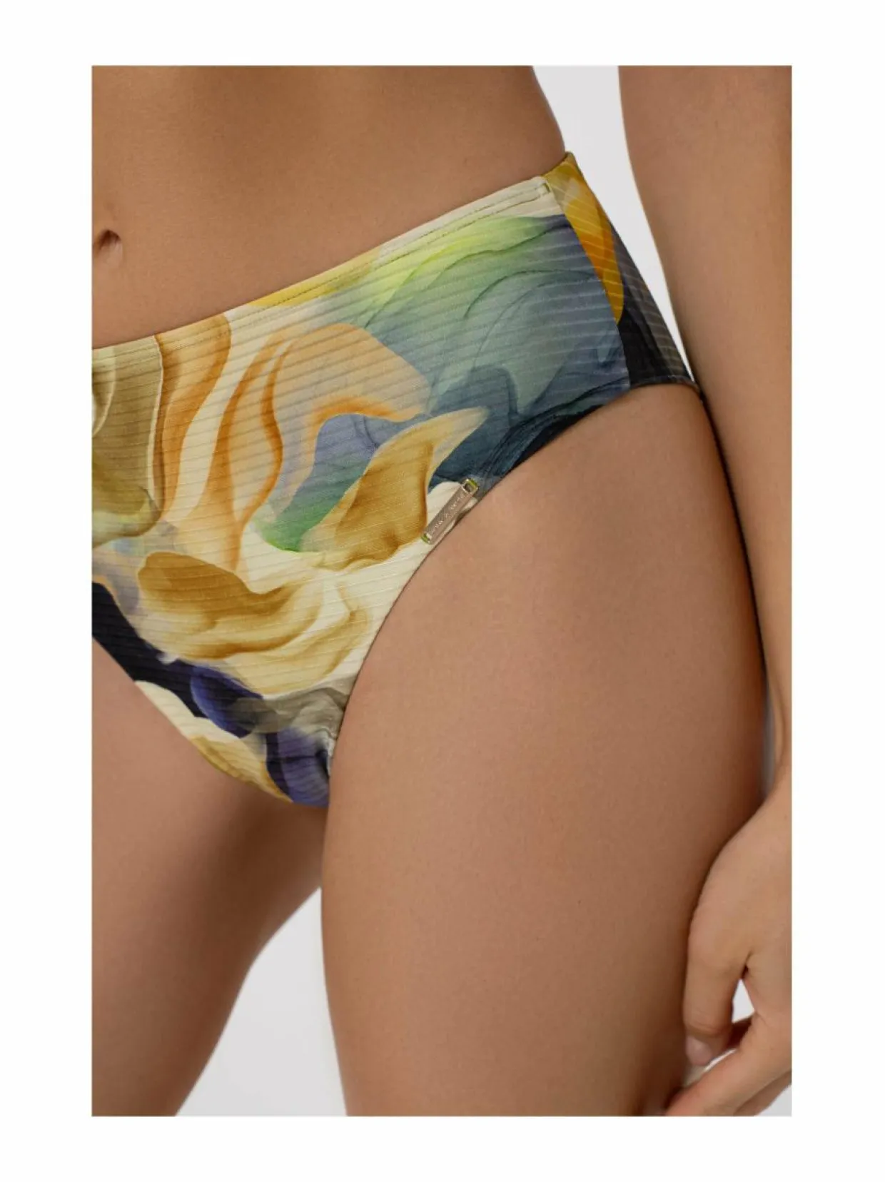 Marc & André Symphonie -bikinialaosa on korkealla vyötäröllä varustettu ja se on valmistettu pehmeästä, kaksinkertaisesta materiaalista, joka on mukava ja pehmeä iholla. Bikinihousujen reunoissa on taitokset, jotka lisäävät mukavuutta. Alusosan takaosassa on V-muotoinen nauha, joka antaa tyylikkään ilmeen. Alusosa on edestä vuorattu. 88 % materiaalista on polyamidia ja 12 % elastaania.