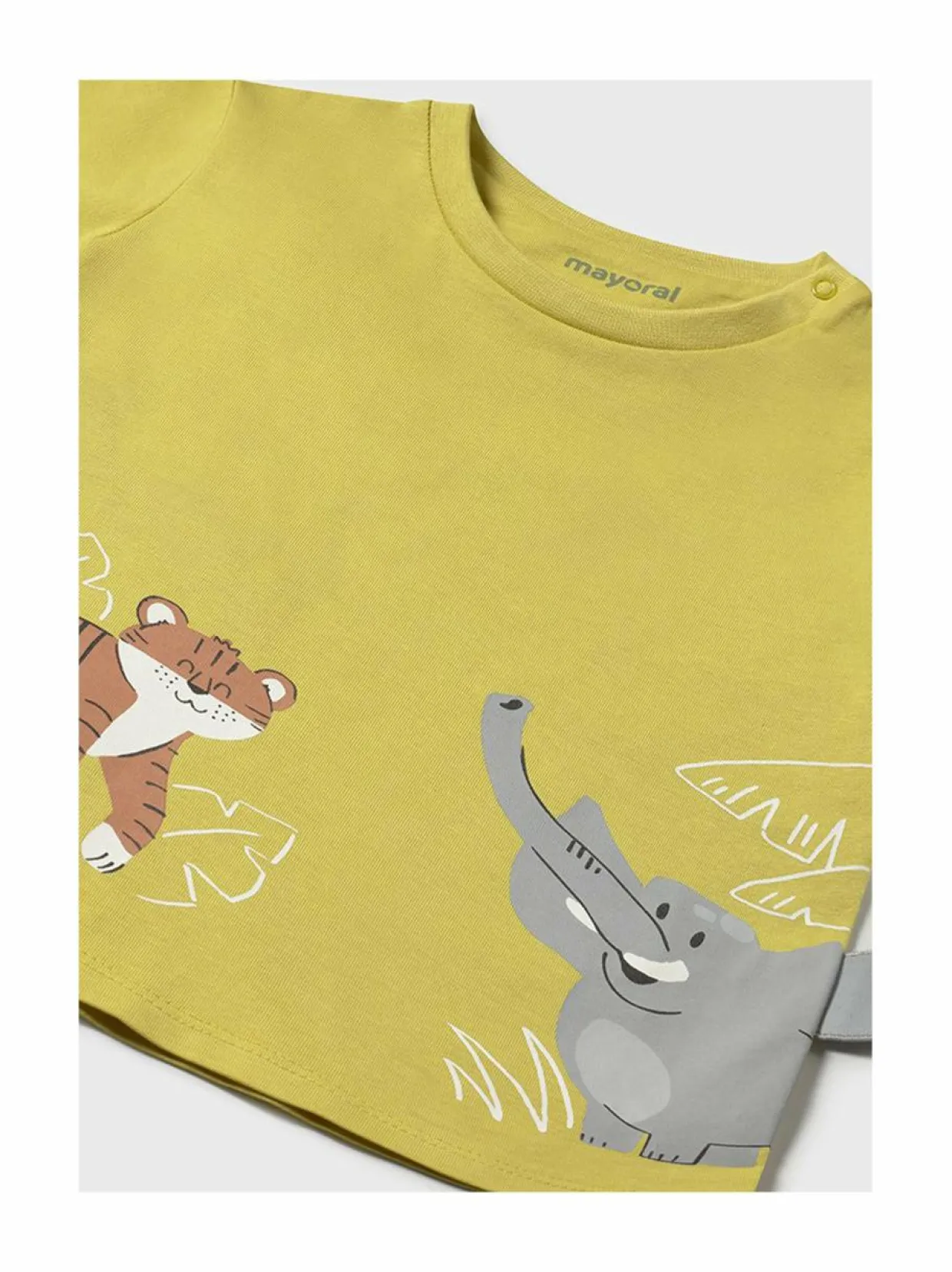 Ihastuttava Mayoral-merkin t-paita on valmistettu pehmeästä puuvillasta ja siinä on söpö eläinaiheinen kuosi. T-paita sopii täydellisesti pienokaisille, jotka rakastavat eläimiä. Se on helppo pukea ja riisua ja se sopii täydellisesti arkikäyttöön. Puuvilla on luonnollinen materiaali, joka on pehmeä ja hengittävä. Puuvilla on ihanteellinen materiaali vauvojen ja lasten vaatteille, koska se on hellävarainen iholle ja hengittää hyvin.