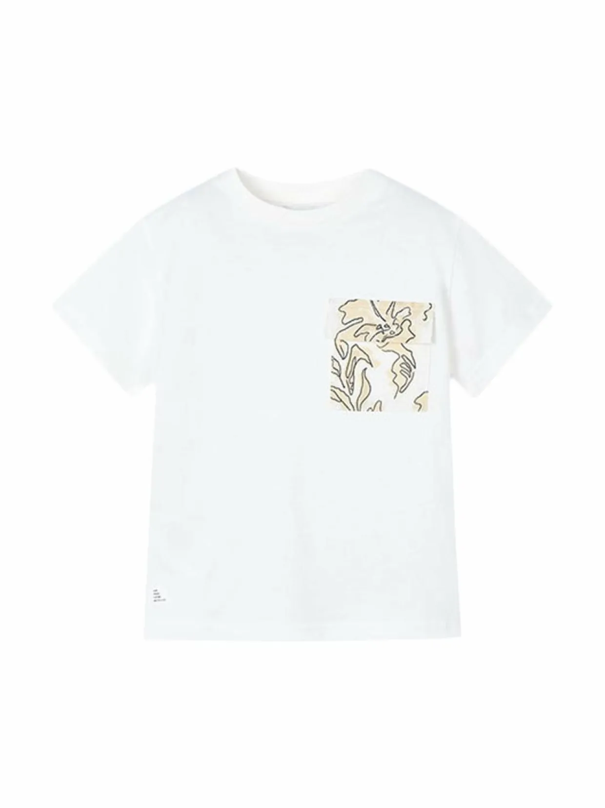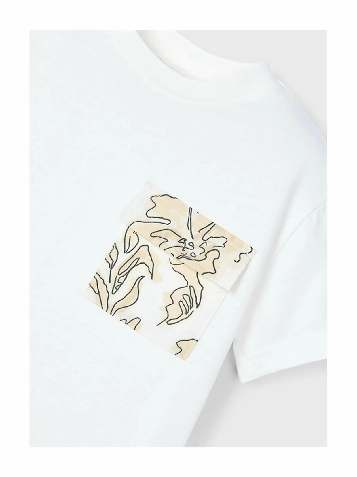 Mukava puuvillasta valmistettu t-paita kukkakuvioisella taskulla rinnassa. Paidassa on normaali istuvuus ja pyöreä pääntie.
