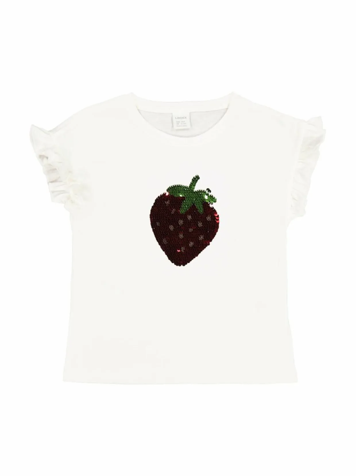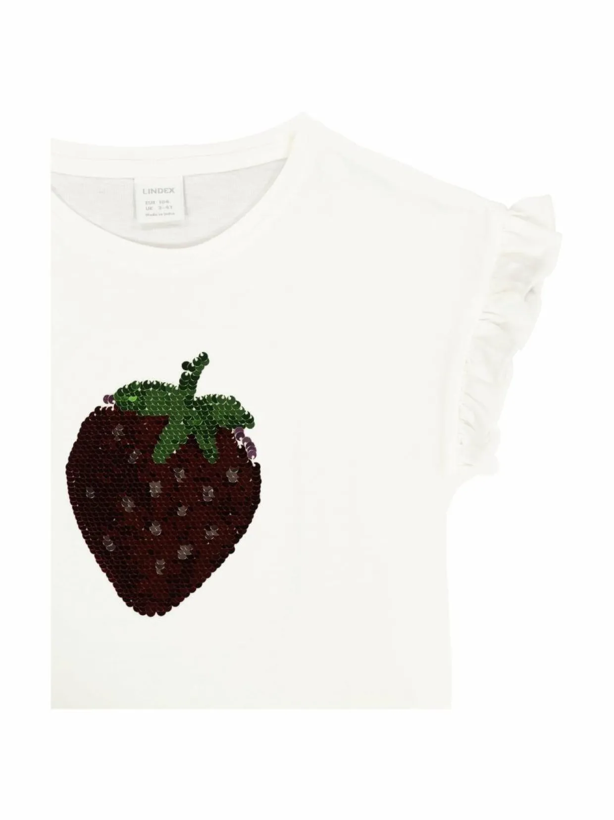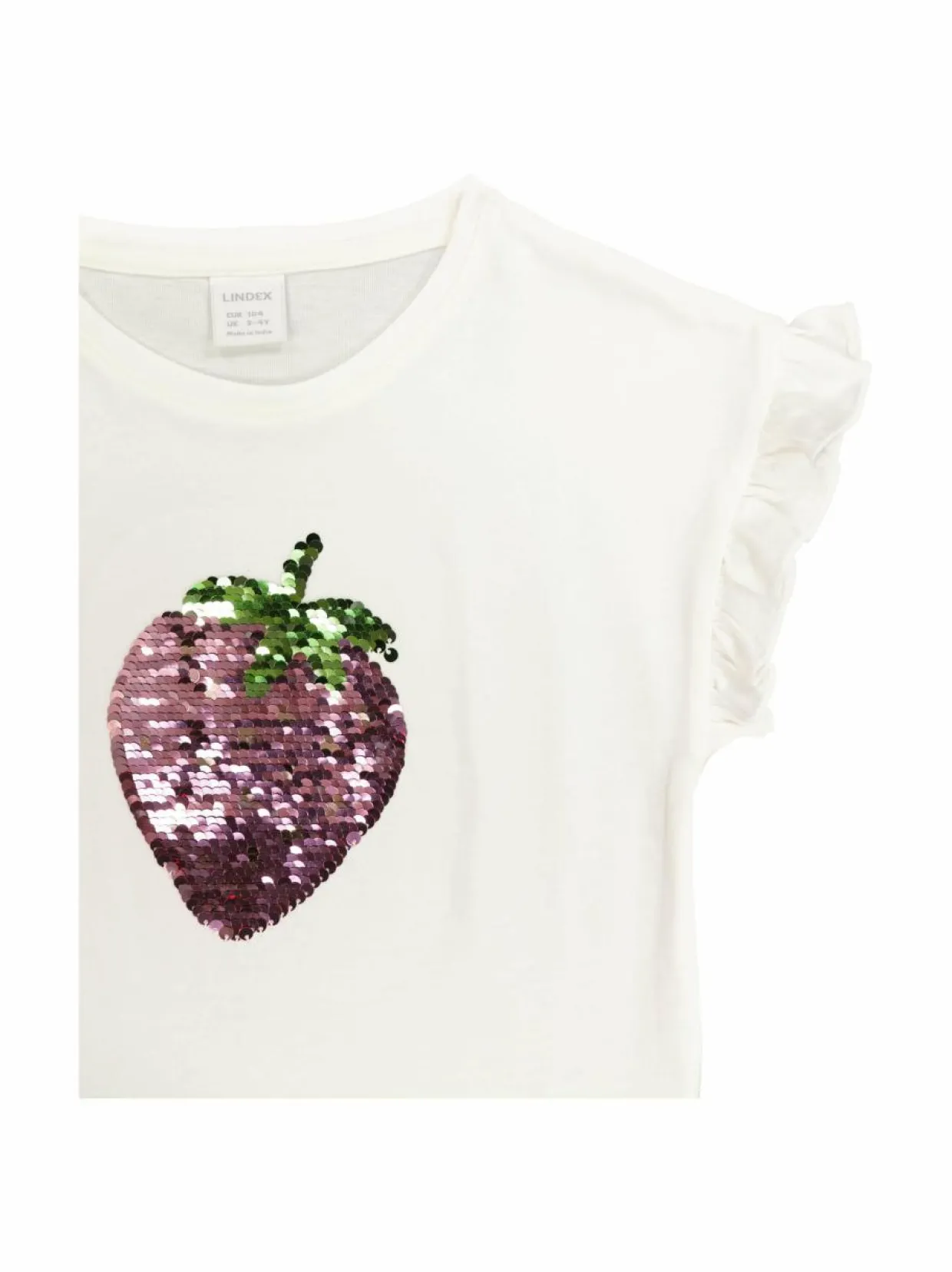 Tämä kaunis paita on valmistettu pehmeästä puuvillasta, joka tuntuu miellyttävältä iholla. T-paidassa on paljettiyksityikohta edessä ja röyhelöreunat viimeistelevät paidan lyhyet hihat. Sopii erinomaisesti niin arkeen kuin juhlaan.