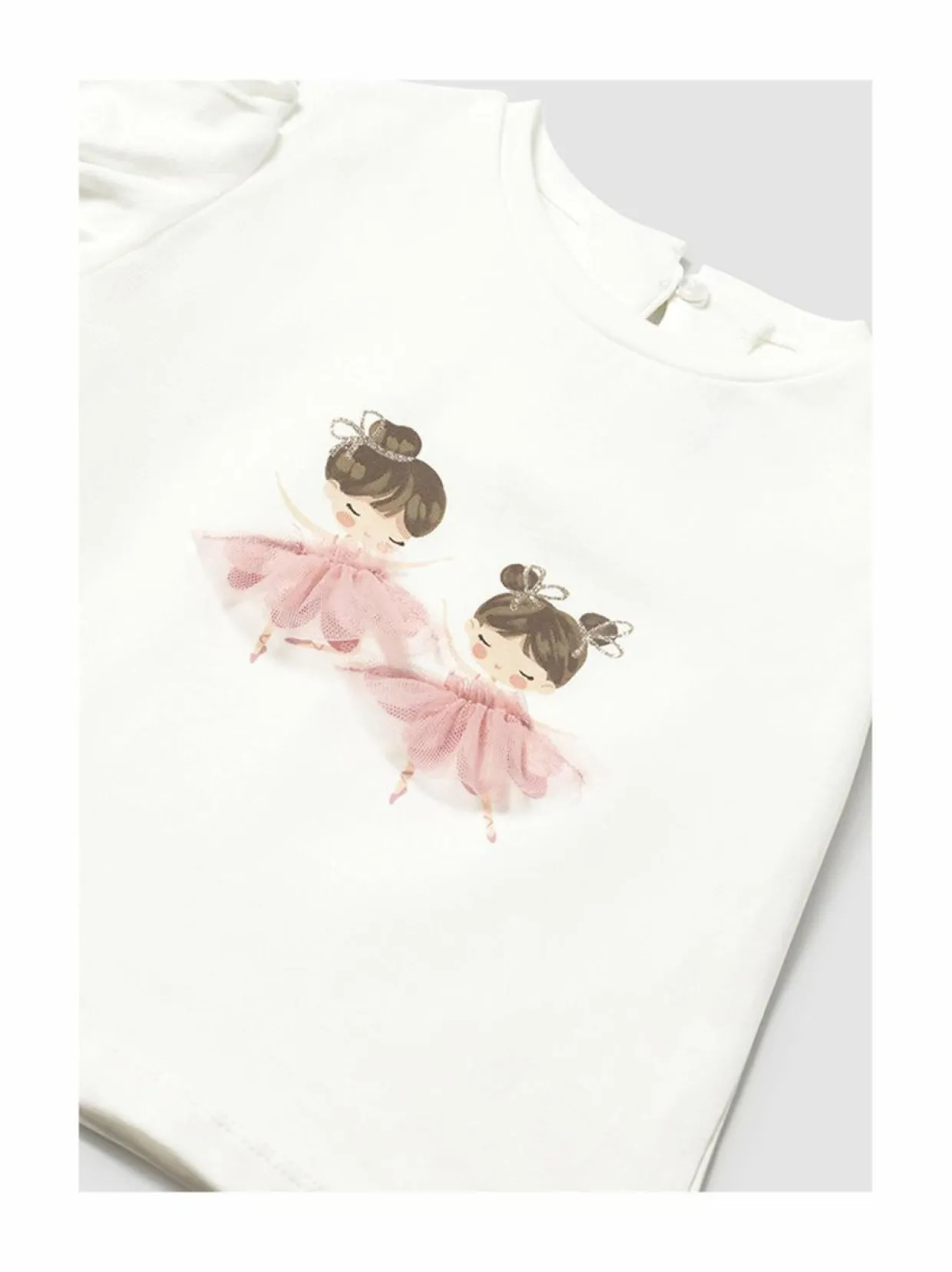 Ihastuttava Mayoral-merkin t-paita on valmistettu pehmeästä ja hengittävästä puuvillasekoitteesta. T-paidassa on söpö ballerina-kuvio edessä. T-paidassa on lyhyet hihat ja pyöreä pääntie. T-paita sopii täydellisesti arkeen ja juhlaan. Puuvilla on luonnollinen materiaali, joka on pehmeä ja mukava iholle. Se on myös hengittävä ja imee kosteutta hyvin. T-paita sopii täydellisesti lapsille, jotka rakastavat tanssia ja balettia.